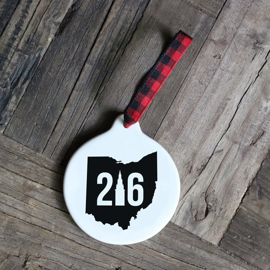 OUR ORNAMENTS ARE PRINTED BY HAND ON 3” PORCELAIN DISCS. THE ORNAMENTS ARE FINISHED WITH A CLASSIC BUFFALO PLAID RIBBON FOR HANGING. OUR ORNAMENTS ARE PERFECT FOR HOUSEWARMING GIFTS, MOVING AWAY GIFTS, HOLIDAY DECOR, AND SOUVENIRS.