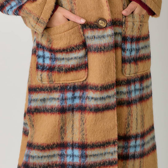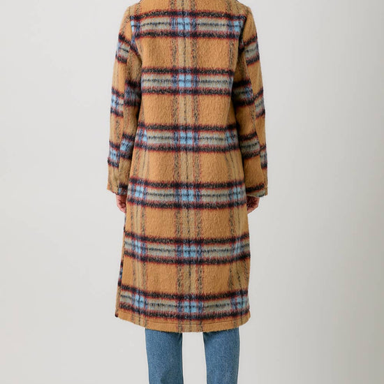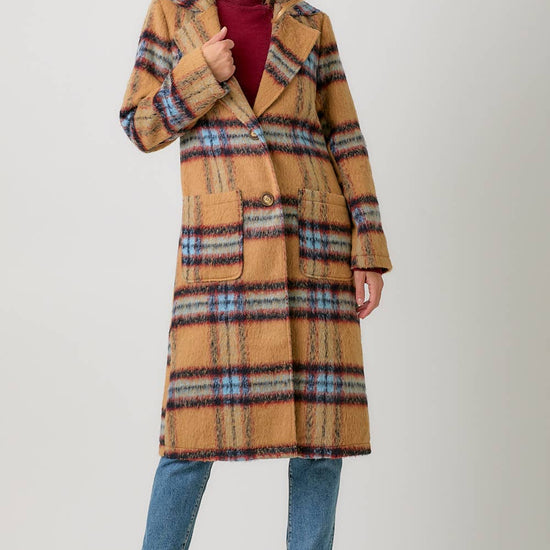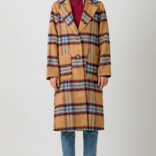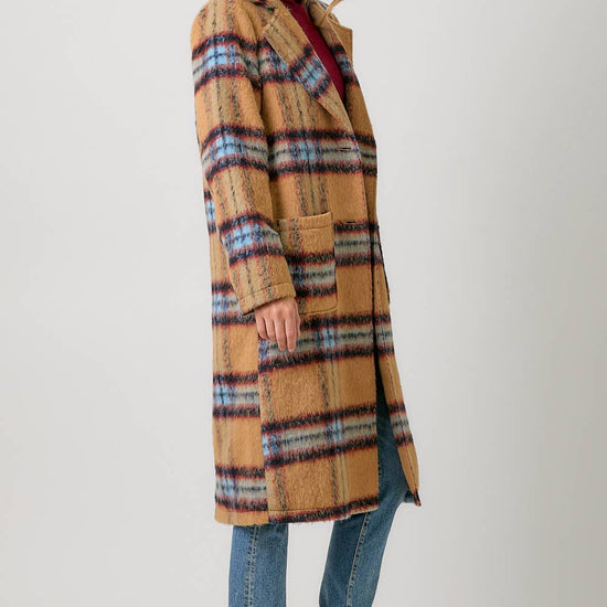 FUZZY PLAID LONG COAT DOUBLE BUTTONED FRONT BOTTOM POCKETS KNEE LENGTH -MODEL IS WEARING IVORY MIX WITH 60760 CARDIGAN AND 60723 TOP / 60815 TOP AND CAMEL MIX WITH 60747 SWEATER -MODEL WEARS: S / MODEL HEIGHT: 5` 9"