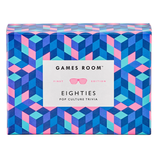 PULL UP YOUR LEG WARMERS AND FIRE UP THE DELOREAN BECAUSE WE'RE HEADING TO THE 80S WITH THIS 80S POP CULTURE TRIVIA FROM GAMES ROOM! WHO WILL BE ON THE A-TEAM AND WHO'LL BE ON TEAM BETAMAX? FROM QUESTIONS ABOUT SUPER MARIO AND STREET FIGHTER TO MADONNA AND GHOSTBUSTERS, PUT YOUR KNOWLEDGE OF THE DECADE TO THE TEST! PACKAGED IN A GEOMETRIC PRINT BOX, THE SET CONTAINS 140 QUESTION CARDS AND INSTRUCTIONS.