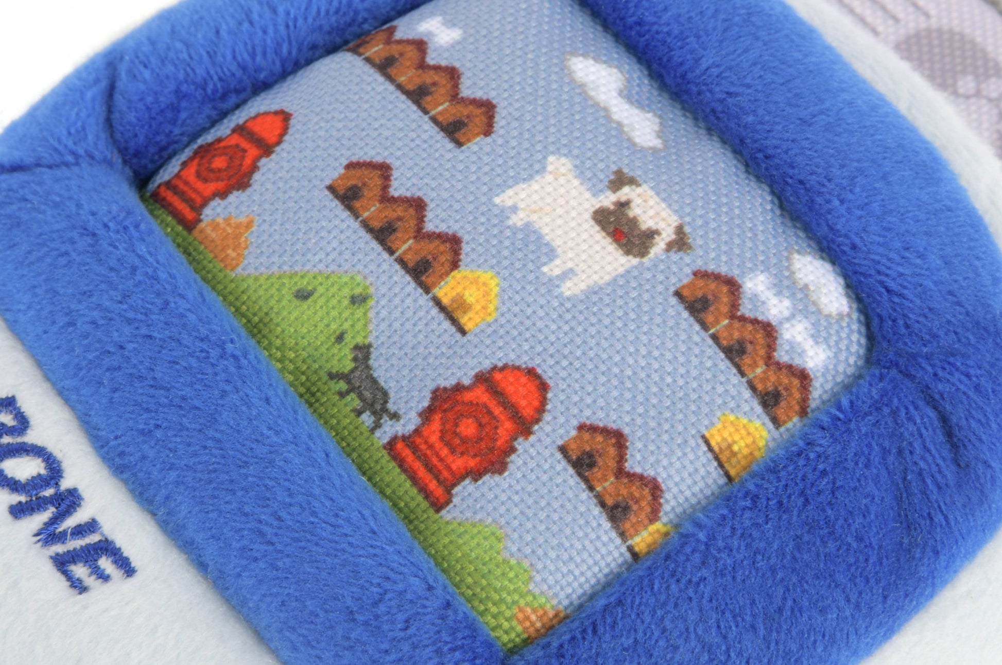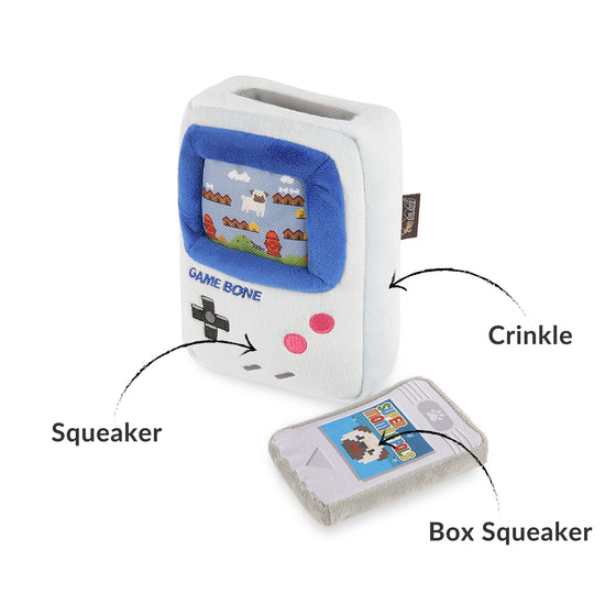 LEVEL UP PLAYTIME FOR YOUR FURRY GAMER WITH P.L.A.Y.’S 90S CLASSICS GAME BONE TOY! THIS GAMEBOY-INSPIRED TOY BOASTS A DETACHABLE VIDEO GAME NAMED “SUPER MOMO & PALS” WITH A BOX SQUEAKER INSIDE FOR DOUBLE THE FUN. THE GAME BONE ITSELF FEATURES A SQUEAKER IN THE BODY FOR THRILLING PLAY AND CRINKLE FABRIC ON THE SIDES FOR AN EXTRA TOUCH OF TEXTURE. WATCH YOUR PUP EMBARK ON A CANINE QUEST WITH MOMO AND HER PALS IN EVERY PLAY SESSION! HAND-MADE CRAFTSMANSHIP, DOUBLE LAYER EXTERIOR AND REINFORCED STITCHING FOR EXTRA DURABILITY ECO-FRIENDLY PLANETFILL® FILLER IS MADE FROM 100% POST-CONSUMER CERTIFIED-SAFE RECYCLED PLASTIC BOTTLES MACHINE WASHABLE AND DRYER FRIENDLY FEATURES AZO-FREE DYES ALL OF OUR TOYS MEET THE SAME STRICT QUALITY STANDARDS FOR MANUFACTURING INFANT AND CHILDREN PRODUCTS. MEET REQUIREMENTS FOR EN71 – PART 1, 2, 3 & 9 (EU), ASTM F963 (US) TOY SAFETY STANDARDS AND REACH - SVHC