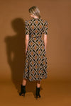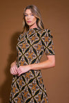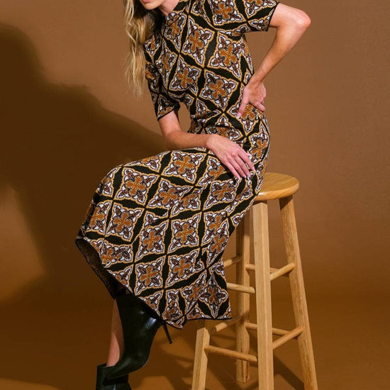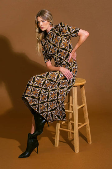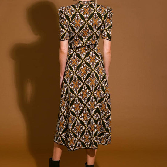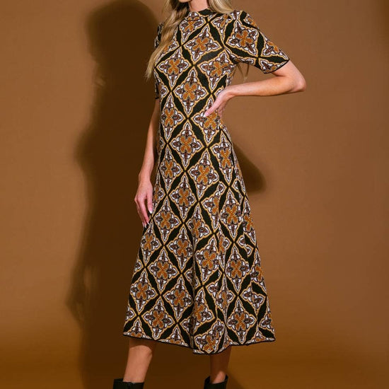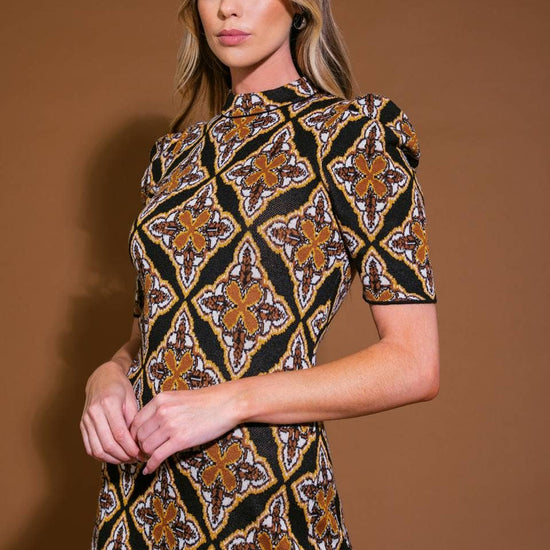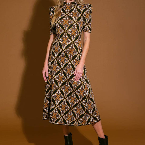 A JACQUARD SWEATER MIDI DRESS WITH HIGH NECKLINE, SHORT SLEEVE AND A LINE SKIRT DETAILS: SELF : 83% POLYESTER 17% NYLON SIZE & FIT - MODEL IS 5`8" AND WEARING SIZE SMALL - MEASUREMENTS TAKEN FROM SIZE SMALL - APPROX. LENGTH: 47"