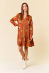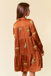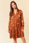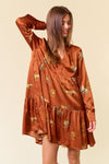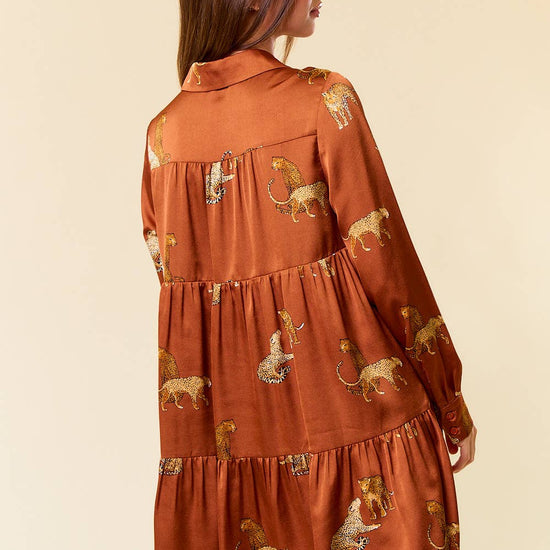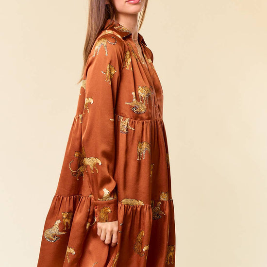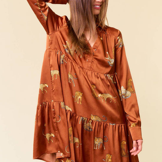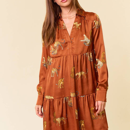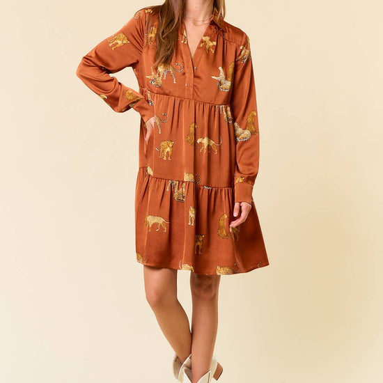ANIMAL PRINTED SATIN SPLIT V-NECK LONG SLEEVE TIERED MINI DRESS W/ SIDE POCKET - FEATURES VARIOUS BIG CAT PRINTS (LEOPARDS, CHEETAHS) IN GOLDEN TONES - TIERED SKIRT WITH THREE LEVELS FOR ADDED VOLUME AND STYLE - MINI LENGTH, HITTING ABOVE THE KNEE - EMPIRE WAISTLINE CREATES A FLATTERING SHAPE STYLE MEASUREMENTS (SIZE SMALL) - TOTAL LENGTH 36" - BUST 19" - WAIST 19" - SLEEVE LENGTH 25 1/2" - SHOULDER 14" 100%POLYESTER | LINING:100%POLYESTER MODEL IS 5'7 1/2"| BUST 33"| WAIST 24"| HIPS 34"| WEARING SIZE SMALL