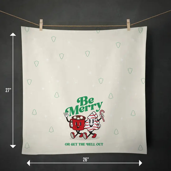 ADD A LITTLE HUMOR TO YOUR HOLIDAY WITH THIS SARCASTIC AND JOLLY HOLIDAY TEA TOWEL. BE MERRY OR GET THE HELL OUT, COMPLETE WITH DANCING HOT COCOA AND CHRISTMAS TREE CAKE RETRO CHARACTERS. THIS HOLIDAY KITCHEN ACCESSORY IS GREAT FOR SECRET SANTA, GIFT EXCHANGES & STOCKING STUFFERS BECAUSE EVERYONE HAS STUFF TO DRY IN THE KITCHEN. THIS ORIGINAL DESIGN IS PRINTED (FULL EDGE-TO-EDGE PRINT) ON A 26 INCH X 27 INCH 100% COTTON FLOUR SACK KITCHEN TOWEL. A WOVEN LOOP IS SEWN INTO THE UPPER BACK CORNER FOR EASY HANGING FROM A KITCHEN HOOK.