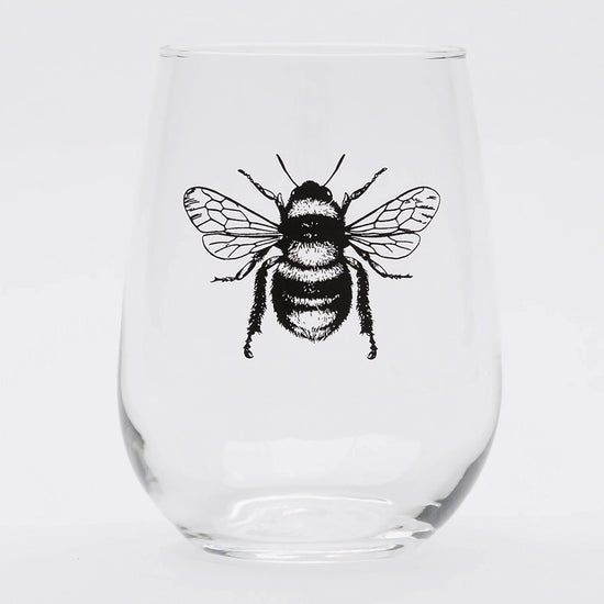 HONEY BEE STEMLESS WINE GLASSES. THE CLASSIC LOOK ON THESE STEMLESS WINE GLASSES WILL MAKE A GREAT ADDITION TO ANY BARWARE COLLECTION. THE IMAGE IS SCREEN-PRINTED, THEN THE INK IS CURED IN AN OVEN, SO THE PRINT WON'T WASH OFF OR FADE.