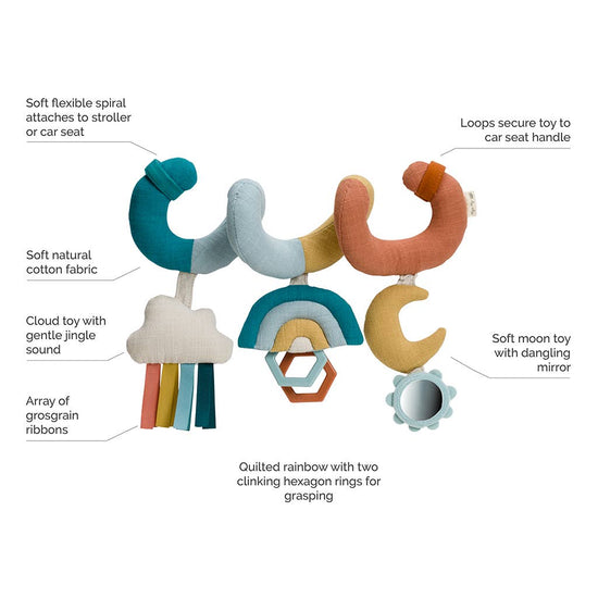 TRAVEL’S ABOUND! ENDLESS ADVENTURES AWAIT WITH YOUR BABE’S NEW TRAVEL TAGALONG, THE ITZY BITZY SPIRAL™ FROM OUR BITZY BESPOKE™ COLLECTION! WATCH AS YOUR BABE REACHES FOR THE DANGLING RAINBOW RINGS, SMILES AT THEIR REFLECTION IN THE HANGING MIRROR, AND GRASPS FOR THE RIBBONS KEEPING THEIR LITTLE HANDS BUSY. OUR NATURAL COTTON FABRICS ARE GENTLE & SOFT TO BABY’S TOUCH. FOR THE MANY TRAVELS AHEAD, EASILY ATTACH ITZY BITZY SPIRAL™ TO CAR SEATS AND STROLLER FOR FUN ON-THE-GO!