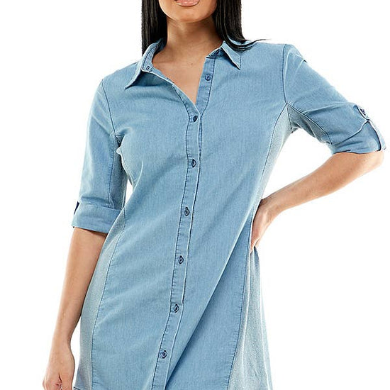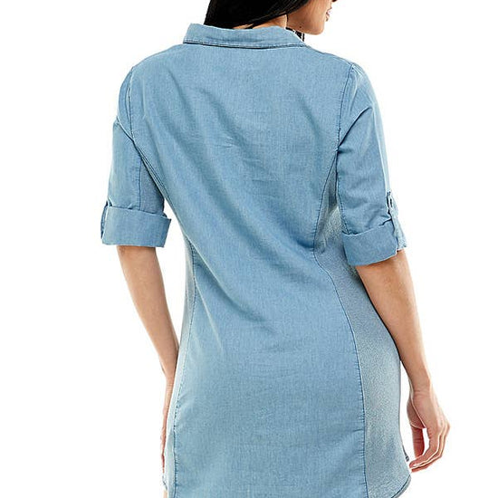 EMBRACE THE TIMELESS BEAUTY EFFORTLESSLY! ELEVATE YOUR FEMININE CHARM WITH OUR CHAMBRAY MINI SHIRT DRESS. THIS LAID-BACK YET STYLISH PIECE FEATURES A BUTTON-UP FRONT, BREAST PATCH POCKETS, CUFFED SLEEVES, AND SUBTLE FADED DETAILS, EFFORTLESSLY COMBINING CASUAL COMFORT WITH ON-TREND FASHION. PERFECT FOR ANY OCCASION, THIS DRESS WILL MAKE YOU FEEL EFFORTLESSLY STYLISH AND CONFIDENT. THIS DRESS IS A CHARMING ADDITION TO YOUR SUMMER WARDROBE. * BUTTON-UP FRONT * MEDIUM SLEEVE * SPREAD COLLAR * SHORT LENGTH DRESS
