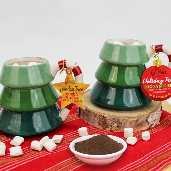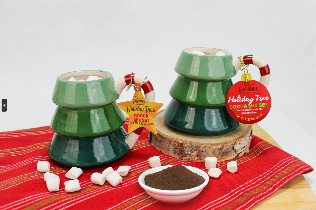 TOO GOOD GOURMET’S HOLIDAY CHRISTMAS TREE MUG SET IS A FESTIVE AND COZY GIFT THAT BRINGS INSTANT HOLIDAY CHEER. EACH SET INCLUDES A DECORATIVE HOLIDAY MUG PAIRED WITH A SINGLE-SERVING COCOA MIX, MAKING IT THE PERFECT PRESENT FOR CHOCOLATE LOVERS. CHOOSE FROM TWO FESTIVE OPTIONS: CLASSIC HOT CHOCOLATE COCOA MIX OR DOUBLE HOT CHOCOLATE COCOA MIX FOR EXTRA INDULGENCE