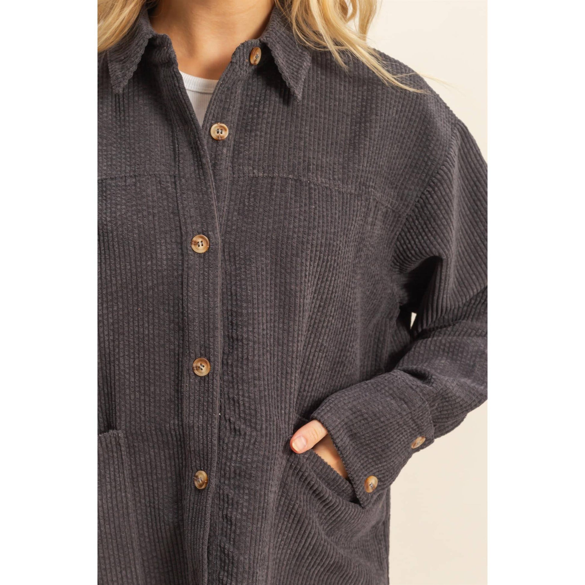 * STYLE NO.: HF25E718 THIS TIMELESS OUTERWEAR FEATURES A STRUCTURED SILHOUETTE WITH A POINTED COLLAR AND PROMINENT FRONT POCKETS, MAKING IT AN IDEAL CHOICE FOR LAYERING OVER CASUAL ENSEMBLES. THE CORDUROY TEXTURE ENHANCES THE TACTILE APPEAL, OFFERING A STYLISH SOLUTION FOR CHILLY EVENINGS OR TRANSITIONAL WEATHER. PAIR WITH SLIM JEANS AND ANKLE BOOTS FOR A HARMONIOUSLY STYLISH LOOK, OR THROW OVER A DRESS TO ADD A TOUCH OF SOPHISTICATION TO YOUR DAYTIME ADVENTURES. 97% POLYESTER 3% SPANDEX MODEL IS 5' 6" TALL, 32" CHEST, 24" WAIST, 32" HIPS AND WEARING A SIZE SMALL IMPORTED. DESIGNED IN THE USA