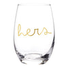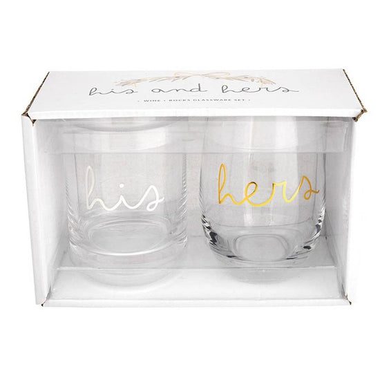 THIS LUXURIOUS GLASSWARE SET IS PERFECT FOR THE BRIDE AND GROOM ON THEIR WEDDING DAY AND FOR MANY YEARS AFTER. PACKAGED IN AN ADORABLE GIFT BOX. •STEMLESS WINE GLASS READS "HERS" IN GOLD FOIL •DOUBLE OLD FASHIONED ROCKS GLASS READS "HIS" IN SILVER FOIL •PERFECT GIFT FOR THE HAPPY COUPLE