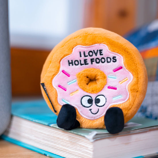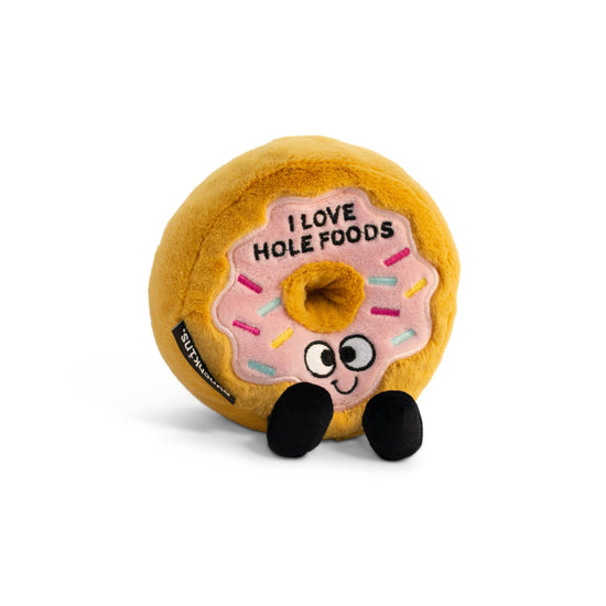 THIS PLUSHIE LOVES WHOLE FOODS AND THINKS OTHERS SHOULD TOO! DONUT WORRY THOUGH, THIS LITTLE GUY ALSO ENJOYS BAGELS, SWISS CHEESE, ONION RINGS, TORTELLINI... WELL, YOU GET THE PICTURE. HIS SWEET SMILE, DANGLY LEGS, AND 3D SPRINKLE DETAILS MAKE HIM IRRESISTIBLE. HE'S AN A-GLAZ-ING GIFT FOR ANY DONUT LOVER. THIS PLUSH IS IDEAL FOR CHILDREN, COLLECTORS, OR ANYONE WHO LOVES COZY AND FUN DÉCOR. A GREAT ADDITION TO GIFT SHOPS AND TOY STORES!
