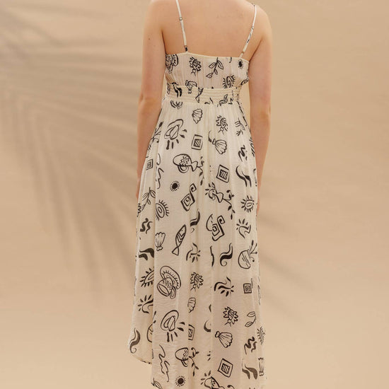SWEETHEART NECKLINE SLEEVELESS ADJUSTABLE SPAGHETTI STRAP SHIRRED WAIST ELASTIC WAIST HANDKERCHIEF HEM DOODLE PRINT LINED MIDI DRESS SHELL: 80% RAYON 20% NYLON LINING: 100% POLYESTER