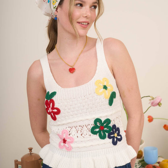 SCOOP NECKLINE SLEEVELESS RUFFLE HEM SLIGHTLY SHEER RUFFLE HEM EMBROIDERED FLORAL DETAIL CROPPED NOT LINED SELF: 100% COTTON CONTRAST: 100% ACRYLIC
