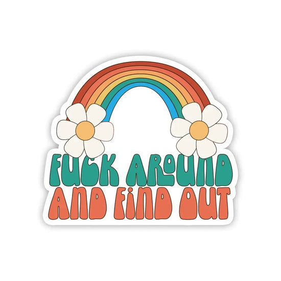 • "FUCK AROUND & FIND OUT" - 3" X 2.6" • THICK, DURABLE VINYL • STRONG ADHESIVE BACK • SUN AND RAIN-PROOF • SCRATCH-RESISTANT • SMOOTH DIE-CUT WITH A CLASSIC WHITE BORDER • PRINTED IN THE USA • PROTECTIVE MATTE LAMINATE FINISH.