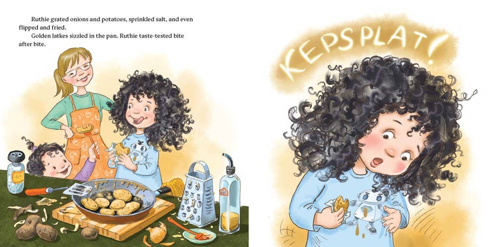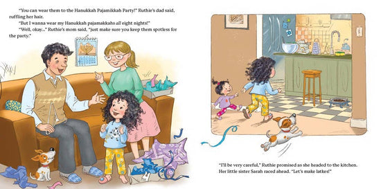 A LIVELY PICTURE BOOK CELEBRATING HOLIDAY TRADITIONS, THE PATIENCE OF PARENTING, SIBLING RELATIONSHIPS, AND CHILDREN’S FONDNESS FOR PAJAMAS, ALONG WITH A FUN, READ-ALOUD, NEW BOOK TO HELP EVERYONE CELEBRATE THE HOLIDAY TOGETHER – IN, OR OUT, OF PAJAMAKKAHS. WHEN RUTHIE RECEIVES PAJAMAKKAHS FOR HANUKKAH, SHE LOVES THEM SO MUCH SHE REFUSES TO TAKE THEM OFF—FOR ALL EIGHT NIGHTS. BUT AS THEY GET SMEARED AND STAINED, SPLATTERED AND SMUDGED, RUTHIE’S DETERMINED TO SHOW HER PARENTS SHE CAN STAY SPOTLESS. WITH GLOBS OF HUMOR, A BIG SPLATTER OF LOVE, AND OUT OF THE GIFT-BOX CREATIVITY, HANUKKAH PAJAMAKKAHS IS A FRESH, NEW CELEBRATION OF A SPECIAL HOLIDAY.