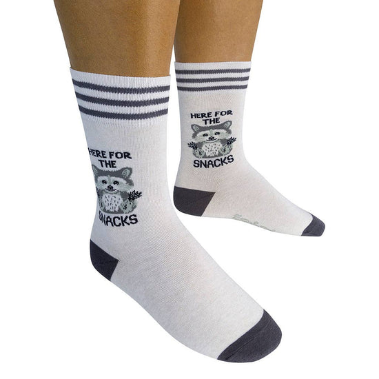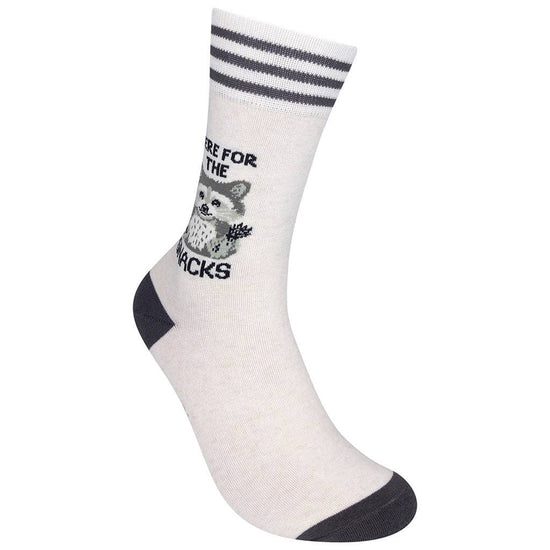 PRIORITIES? CRYSTAL CLEAR. THESE HERE FOR THE SNACKS SOCKS MAKE YOUR INTENTIONS KNOWN THE MOMENT YOU WALK IN THE ROOM. OFF-WHITE WITH A BROWN TOE, HEEL, AND TRIPLE-STRIPE CUFF, THEY FEATURE BOLD BLACK TEXT THAT SPELLS OUT “HERE FOR THE SNACKS” PAIRED WITH A GRAY-AND-BLACK RACCOON HOLDING ITS PAWS UP LIKE IT JUST GOT CAUGHT ELBOWS-DEEP IN THE CHIP BOWL. (RELATABLE.) PERFECT FOR GRAZERS, MIDNIGHT FRIDGE RAIDERS, AND ANYONE WHO IDENTIFIES SPIRITUALLY WITH TRASH PANDAS. WEAR THEM PROUDLY TO PARTIES, MOVIE NIGHTS, OR LITERALLY ANYWHERE FOOD IS INVOLVED. MADE FROM A SOFT, STRETCHY COTTON BLEND (70% COTTON, 28% POLYESTER, 2% ELASTIC), THESE MID-CALF CREW SOCKS FIT MOST FEET (MEN 6-11, WOMEN 7.5-12) AND FEEL GREAT WHETHER YOU’RE SNACKING, PRETENDING NOT TO BE SNACKING, OR PLANNING YOUR NEXT SNACK.