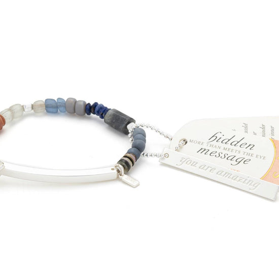 YOU ARE AMAZING "LIKE WHISKEY IN A TEACUP YOU ARE BOTH BEAUTIFUL AND STRONG. LET THIS BRACELET BE YOUR DAILY REMINDER OF YOUR INNER POWER." WITH AN EMPOWERING PHRASE OF AFFIRMATION ENGRAVED ON EACH METAL BAR, THESE BRACELETS ARE MORE THAN MEETS THE EYE. INTENTIONALLY DESIGNED WITH HAND CUT GLASS BEADS FROM NEPAL & ENERGETIC SEMI-PRECIOUS STONES TO CREATE AN INSPIRATIONAL BRACELET FOR MULTI-SEASON WEAR. EACH BRACELET IS ACCENTED WITH GOLD OR SILVER DIPPED BEADS AND INCLUDES A BONUS CHARM WITH MATCHING ENGRAVED AFFIRMATION, PERFECT TO ADD TO A KEYCHAIN! • FEATURING CLASSIC OR EDGY STATEMENTS • IRON, BRASS, SEMI-PRECIOUS STONE, NEPAL GLASS BEADS, METAL BEADS AND SHELL BEADS • STRETCH CORD AND TOGGLE CLOSURE • INCLUDES A BONUS METAL TAG WITH MATCHING INSPIRATIONAL STATEMENT FOR USE A KEYCHAIN • PLEASE NOTE: EACH BRACELET IS HANDCRAFTED USING NATURAL MATERIALS, SO SLIGHT VARIATIONS IN COLOR AND SIZE ADD TO THE DISTINCTIVE BEAUTY OF EACH PIECE. LABRADORITE | STONE OF MAGIC