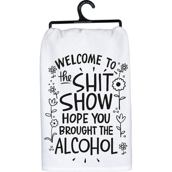 A BLACK AND WHITE COTTON KITCHEN TOWEL FROM OUR LOL MADE YOU SMILE COLLECTION DISPLAYING BEAUTIFUL HAND ILLUSTRATED FLOWER DESIGNS WITH HUMOROUS SENTIMENT THAT READS "WELCOME TO THE SHIT SHOW - HOPE YOU BROUGHT THE ALCOHOL." OUR HOPE YOU BROUGHT ALCOHOL KITCHEN TOWEL IS MACHINE-WASHABLE FOR CONVENIENT CLEANING. PACKAGED ON A BLACK PLASTIC HANGER TO EASILY DISPLAY ON RACK. A FUN AND FUNCTIONAL EVERYDAY KITCHEN ACCENT. NOT ELIGIBLE FOR DISCOUNTING.