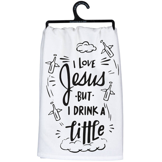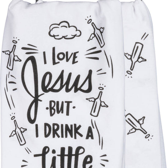 A BLACK AND WHITE COTTON KITCHEN TOWEL FEATURING "I LOVE JESUS BUT I DRINK A LITTLE" SENTIMENT WITH DOUBLE-SIDED CLOUD AND ANGEL WINE BOTTLE DESIGNS. MACHINE-WASHABLE.