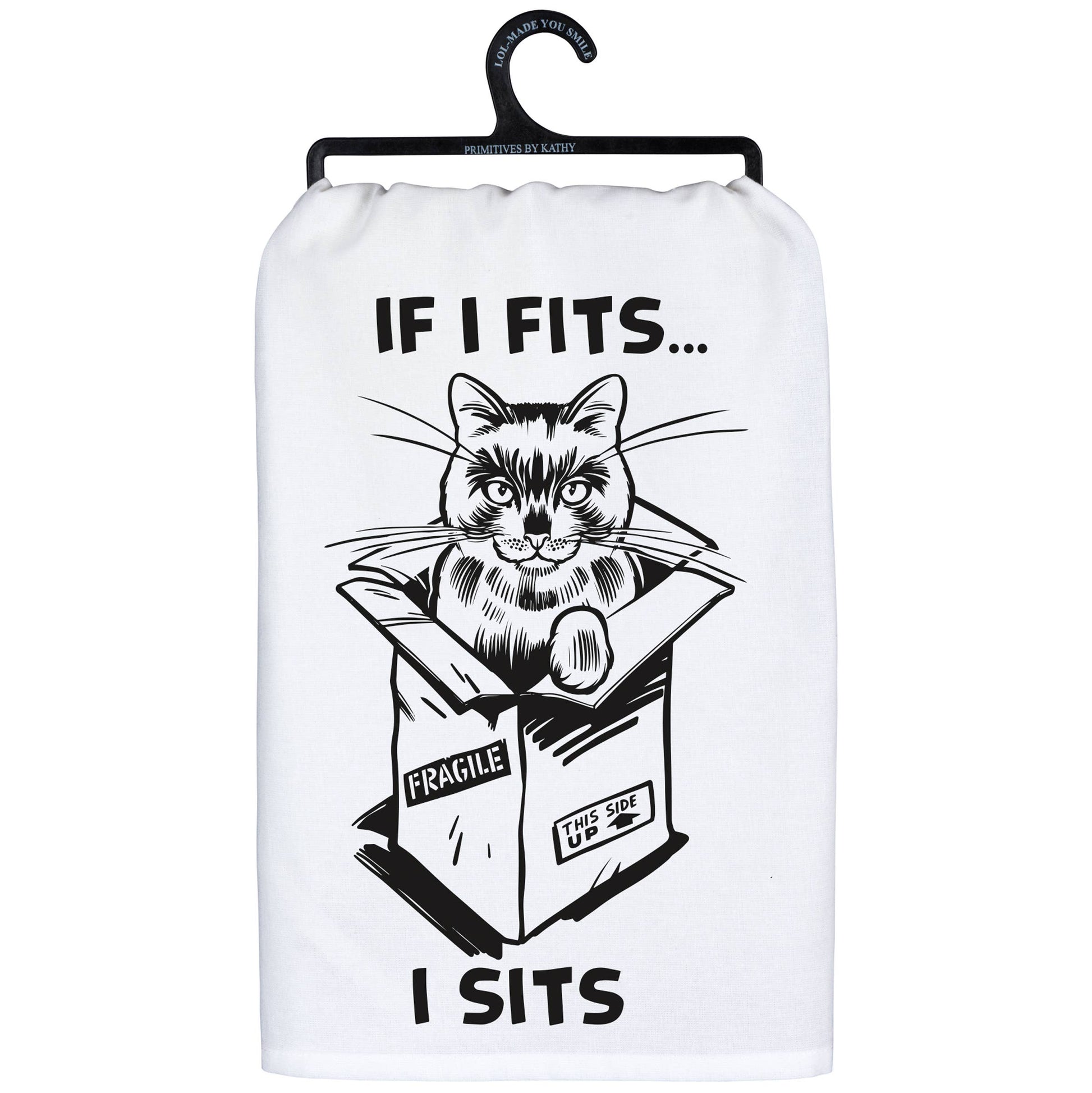 A BLACK AND WHITE COTTON KITCHEN TOWEL FROM OUR PET COLLECTION DISPLAYING A FUN HAND ILLUSTRATED DESIGN OF A SASSY CAT IN A SHIPPING BOX WITH A HUMOROUS CAT-THEMED SENTIMENT THAT READS "IF I FITS... I SITS." OUR IF I FITS I SITS KITCHEN TOWEL IS CONVENIENTLY MACHINE-WASHABLE FOR EASY CLEANING. FUNNY KITCHEN TOWEL IS PACKAGED ON A BLACK PLASTIC HANGER TO EASILY DISPLAY ON RACK. A FUN PET-THEMED GIFT PERFECT FOR AN EVERYDAY KITCHEN ACCESSORY.