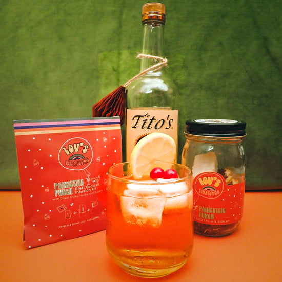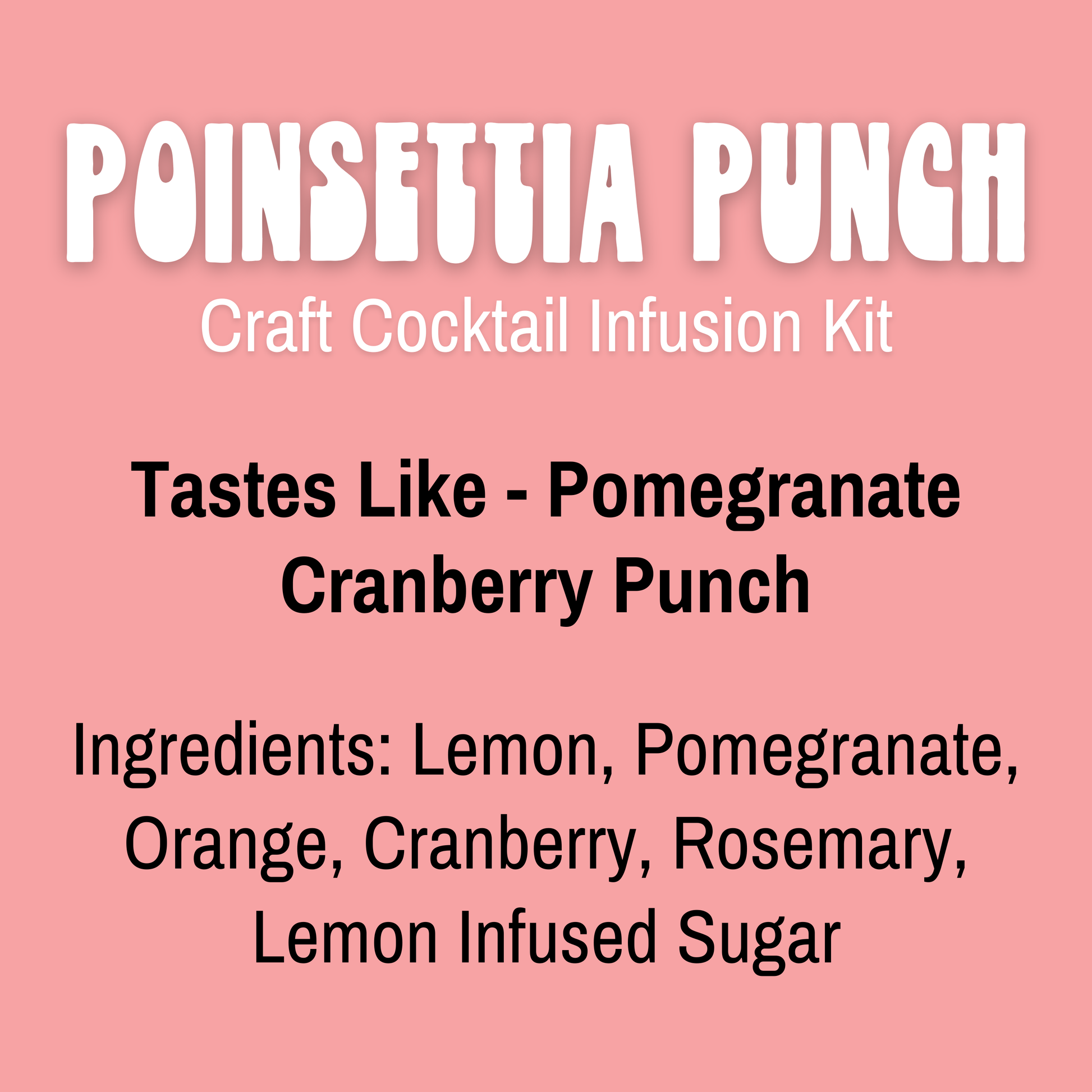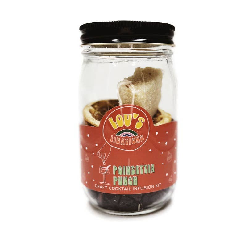 WHO SAYS HOLIDAY PUNCH IS HUMDRUM? NOT US! OUR POINSETTIA PUNCH IS WHAT ALL THE COOL CATS ARE SIPPING THIS SEASON. IT’S LIGHT AND BUBBLY, SO THERE’S PLENTY OF ROOM LEFT OVER FOR SECONDS AND THIRD HELPINGS OF YOUR FAVORITE HOLIDAY DISHES. FRESH CRANBERRIES MINGLE WITH POMEGRANATE, ALONG WITH DASHES OF ROSEMARY, ORANGE, LEMON, AND LEMON-INFUSED SUGAR. YOU WON’T EVEN THINK OF EGGNOG (GASP) WITH THIS MELLOW CRANBERRY SPRITZER BREWING IN YOUR PUNCH BOWL. WHAT'S INSIDE: LEMON, POMEGRANATE, ORANGE, CRANBERRY, ROSEMARY, LEMON INFUSED SUGAR INSTRUCTIONS: ADD 12 OUNCES OF VODKA OR GIN TO THE JAR. REFRIGERATE FOR 4 HOURS FOR QUICK USE OR UP TO 3 DAYS. SHAKE AND STRAIN. ADD YOUR FAVORITE MIXER. SERVES 8-10. USE WITHIN 1 YEAR. ONCE MIXED, USE WITHIN 30 DAYS AND KEEP REFRIGERATED. ALCOHOL NOT INCLUDED.