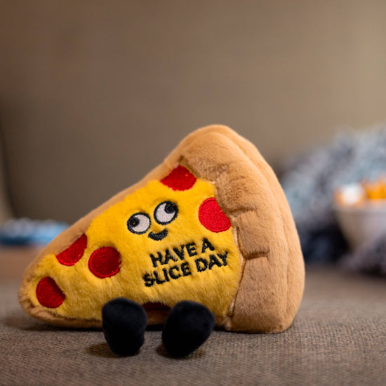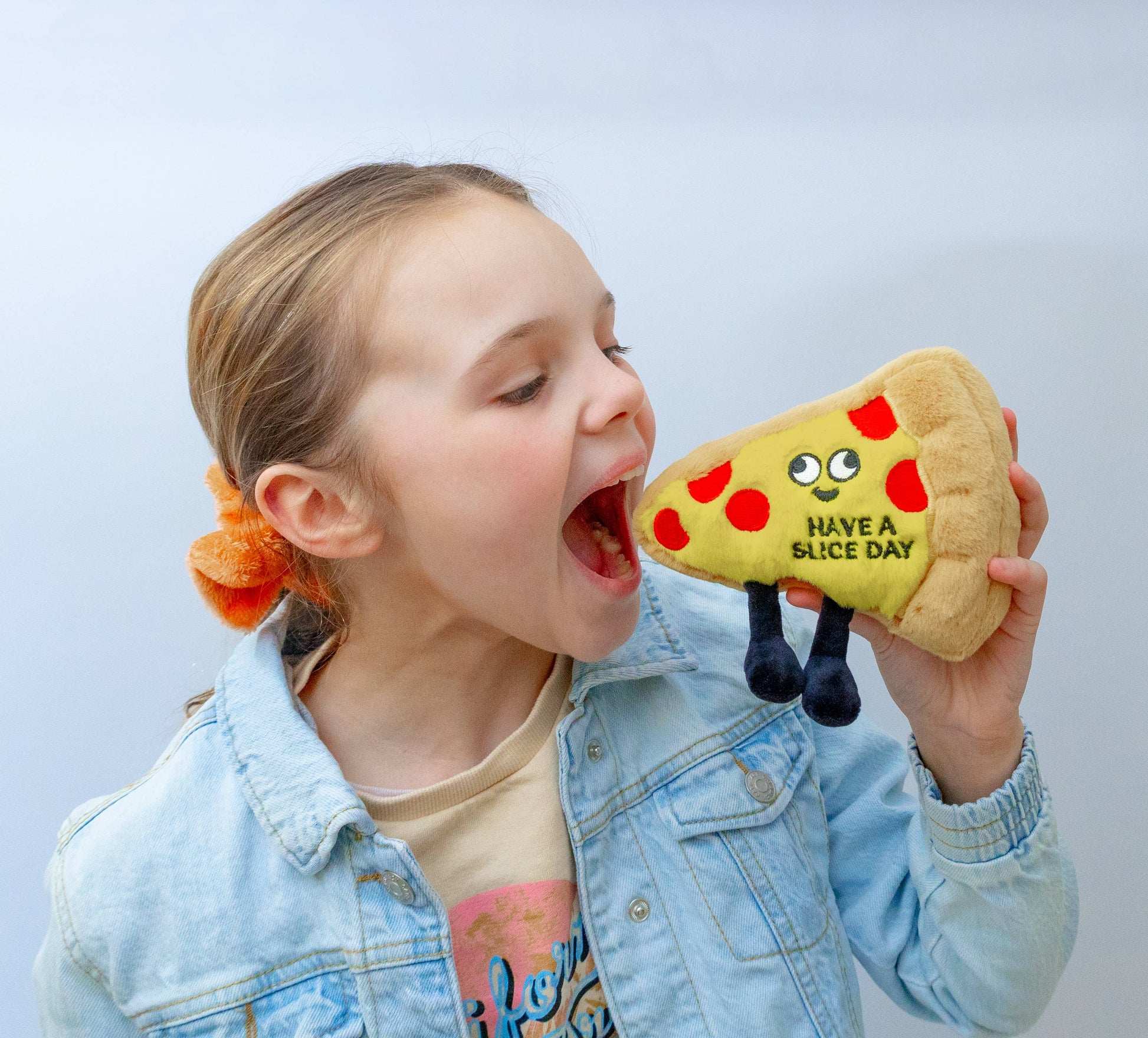 THIS PERKY PIECE OF PEPPERONI PIZZA WANTS YOU TO HAVE A SLICE DAY! AND CRUST US, HE REALLY MEANS IT! HE’S HERE TO REMIND YOU THAT THERE’S ALWAYS ROOM TO MAKE ANY DAY A GOOD DAY (AND THAT THERE’S ALWAYS ROOM FOR PIZZA). HIS CHEESY EXPRESSION, DANGLY LEGS, AND 3D TOPPINGS MAKE HIM A GRATE INSPIRATIONAL GIFT FOR ANY KIDDO. THIS PLUSH IS IDEAL FOR CHILDREN, COLLECTORS, OR ANYONE WHO LOVES COZY AND FUN DÉCOR. A GREAT ADDITION TO GIFT SHOPS AND TOY STORES!