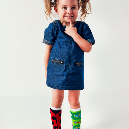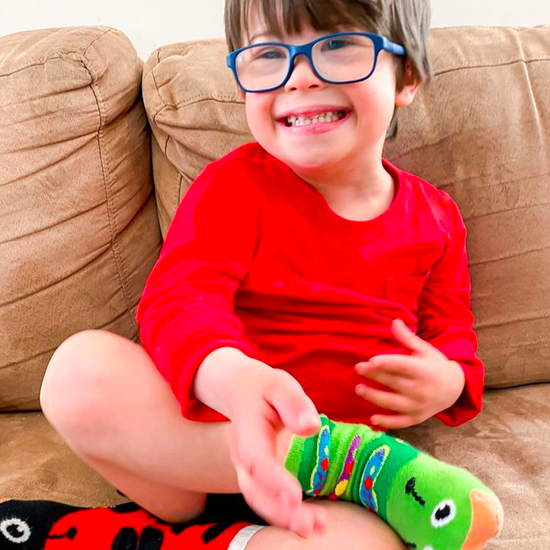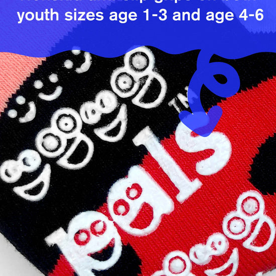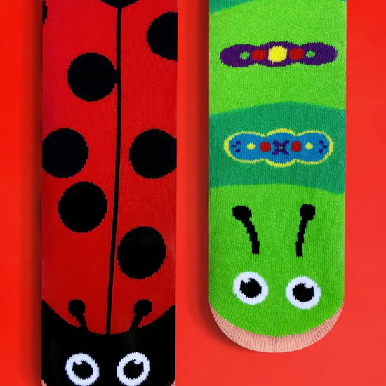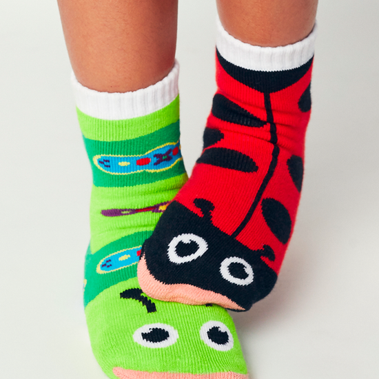 THIS FUNKY PAIR OF GRIPPY KIDS SOCKS IS MISMATCHED AS TWO OF OUR FAVORITE TINY ANIMALS - A LADYBUG AND CATERPILLAR! THESE TWO BACKYARD BUGS ARE BEST BUDDIES. SWEETER THAN CANDY, THESE SOCKS ARE A GREAT EASTER BASKET STUFFER! (PAIR THESE KIDS SOCKS WITH OUR LADYBUG & CATERPILLAR ADULT SOCKS FOR THE CUTEST MOMMY AND ME GIFTS FOR MOTHERS DAY, TOO!) LET'S BE PALS! WE DON'T HAVE TO MATCH TO BE BESTIES. DETAILS • CREW-LENGTH TUBE SOCKS FOR TODDLERS AND KIDS • NON-SLIP GRIPS FOR SAFETY • UNISEX FIT FOR BOYS AND GIRLS • DESIGNS ARE WOVEN IN (NEVER PRINTED ON) • IMAGE QUALITY STAYS GREAT WHEN THESE FUN SOCKS ARE WORN AND STRETCHED! • SUPER STRETCHY, COMFY SOCKS EVERYONE LOVES. • MEDIUM-WEIGHT, QUALITY THICKNESS • 85% COTTON, 13% POLYAMIDE, 2% SPANDEX • A PERFECT BIRTHDAY PRESENT! • DISPLAY PALS HANGING UP, AND THEY WILL BE THE BEST SELLING GIFT IN YOUR STORE!
