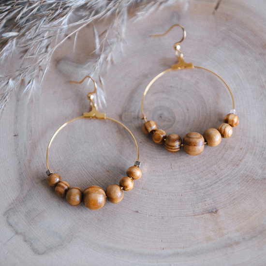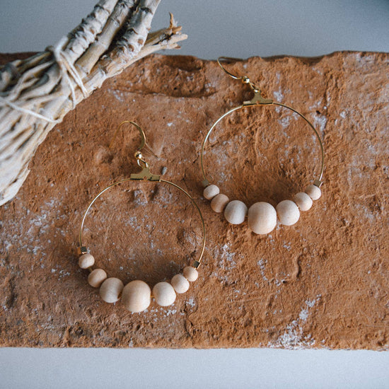 ELEVATE YOUR STYLE WITH THESE STUNNING HANDMADE WOODEN BEAD HOOP EARRINGS! FEATURING NATURAL, LIGHTWEIGHT WOODEN BEADS ARRANGED ON A SLEEK GOLD-TONE HOOP, THESE BOHO-INSPIRED EARRINGS OFFER A PERFECT BLEND OF RUSTIC CHARM AND MODERN ELEGANCE. THEIR NEUTRAL TONES MAKE THEM VERSATILE FOR ANY OUTFIT, FROM CASUAL EVERYDAY WEAR TO CHIC STATEMENT LOOKS.