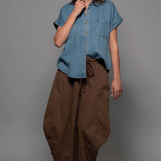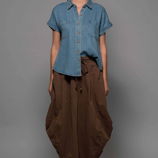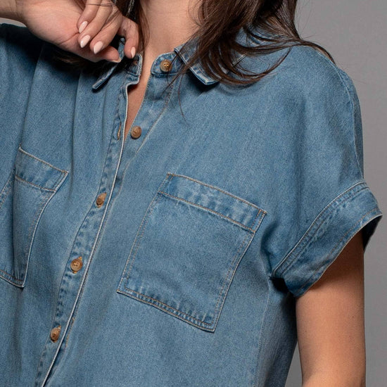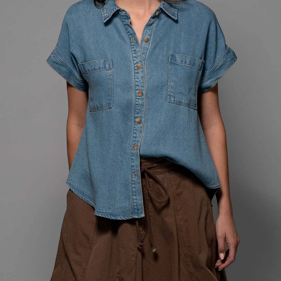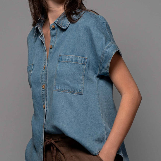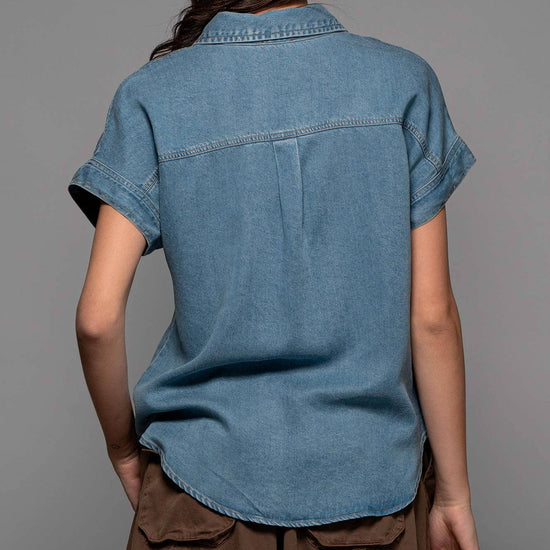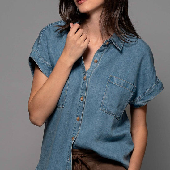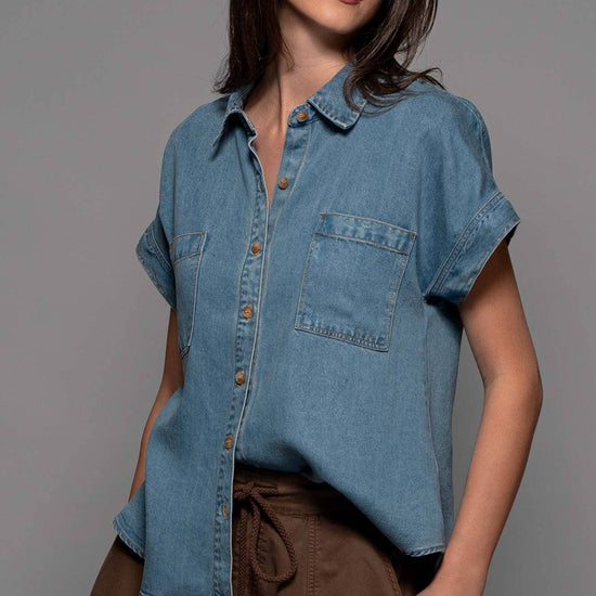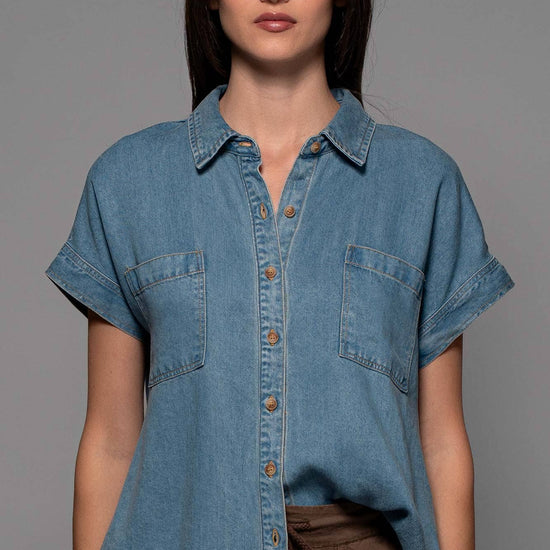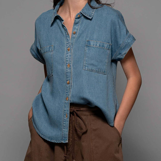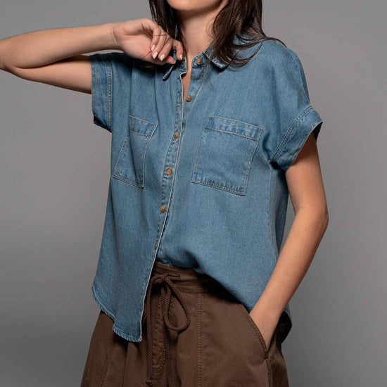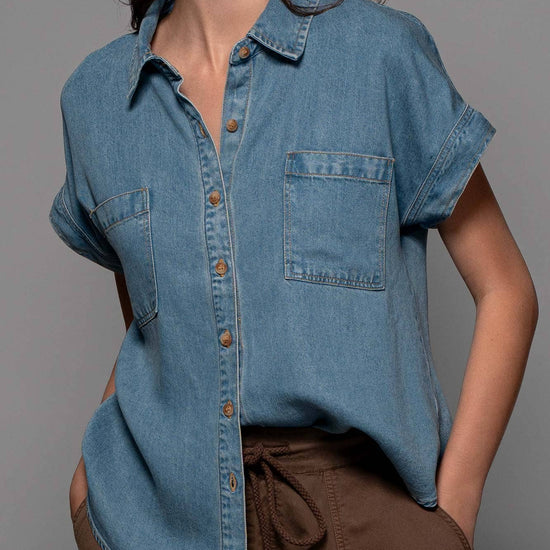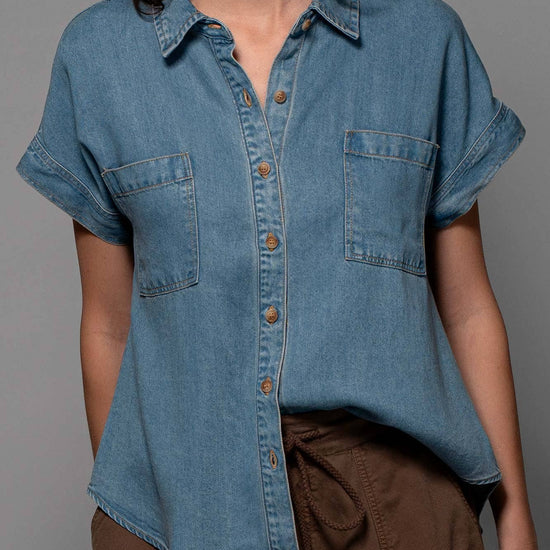 TRANSFORM YOUR SPRING COLLECTION WITH THIS LIGHTWEIGHT DENIM TOP MADE FROM PREMIUM LYOCELL THAT FEATURES CHEST FLAP POCKETS, SHORT CUFFED SLEEVES AND A COLLARED V-NECK, CREATING A BLEND OF CLASSIC AND MODERN STYLES. FEATURES: • 100% LYOCELL • S-L: 2-2-2 • LIGHTWEIGHT LYOCELL DENIM CONSTRUCTION • BUTTON FRONT CLOSURE • CAMP COLLAR DETAIL • SHORT SLEEVES WITH A CUFF • MADE IN VIETNAM