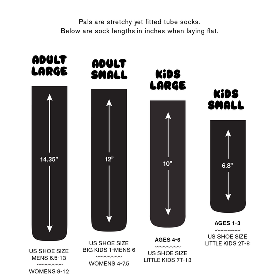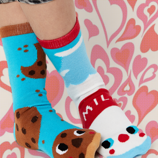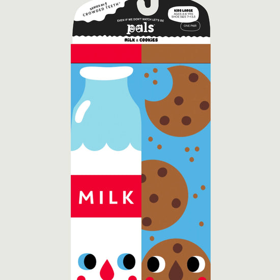 THESE YUMMY NON-SLIP SOCKS SOCKS ARE MISMATCHED AS A FOOD DUO EVERYBODY LOVES - MILK AND COOKIES! SWEETER THAN CANDY, THESE SOCKS ARE A CUTE EASTER BASKET STUFFER, TOO! THIS PAIR IS FROM THE PALS TASTE BUDS COLLECTION DESIGNED BY ARTIST MICHELLE ROMO (AKA CROWDED TEETH). LET'S BE PALS! WE DON'T HAVE TO MATCH TO BE BESTIES. DETAILS • CREW-LENGTH TUBE SOCKS FOR TODDLERS AND KIDS • NON-SLIP GRIPS FOR SAFETY • UNISEX FIT FOR BOYS AND GIRLS • DESIGNS ARE WOVEN IN (NEVER PRINTED ON) • IMAGE QUALITY STAYS GREAT WHEN THESE FUN SOCKS ARE WORN AND STRETCHED! • SUPER STRETCHY, COMFY SOCKS EVERYONE LOVES. • MEDIUM-WEIGHT, QUALITY THICKNESS • COMBED COTTON 76% POLYESTER 13% NYLON 9% SPANDEX 2% • A PERFECT BIRTHDAY PRESENT! • DISPLAY PALS HANGING UP, AND THEY WILL BE THE BEST SELLING GIFT IN YOUR STORE!