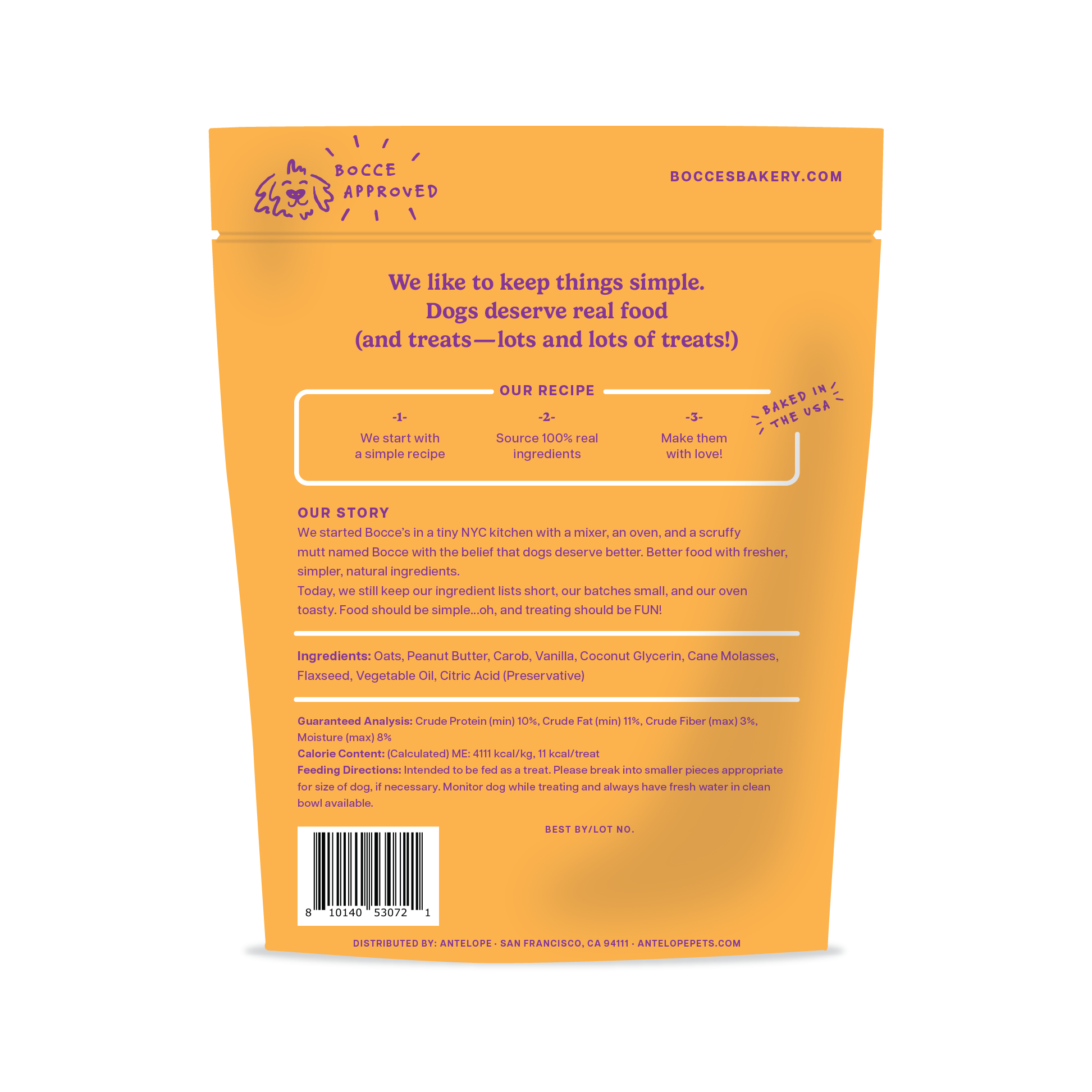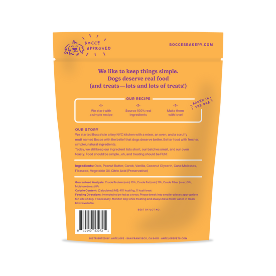 LOOKS LIKE SANTA LEFT SOME MILK ‘N COOKIES BEHIND…THESE SOFT AND CHEWY COOKIES ARE LIMITED INGREDIENT AND PERFECT FOR PUPS ON SANTA’S NICE LIST! *PEANUT BUTTER, CAROB, & VANILLA SOFT AND CHEWY RECIPE *NATURAL WHEAT-FREE AND LIMITED INGREDIENT TREATS *BAKED IN THE USA WITH 100% REAL INGREDIENTS *FOR PUPS ON SANTA’S NICE LIST! INGREDIENTS: OATS, PEANUT BUTTER, CAROB, VANILLA, COCONUT GLYCERIN, CANE MOLASSES, FLAXSEED, VEGETABLE OIL, CITRIC ACID (PRESERVATIVE) GUARANTEED ANALYSIS: CRUDE PROTEIN (MIN) 10%, CRUDE FAT (MIN) 11%, CRUDE FIBER (MAX) 3%, MOISTURE (MAX) 8% CALORIES: 14 CAL/TREAT