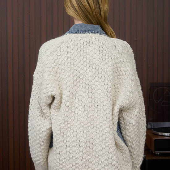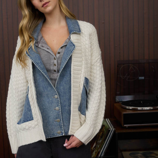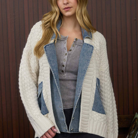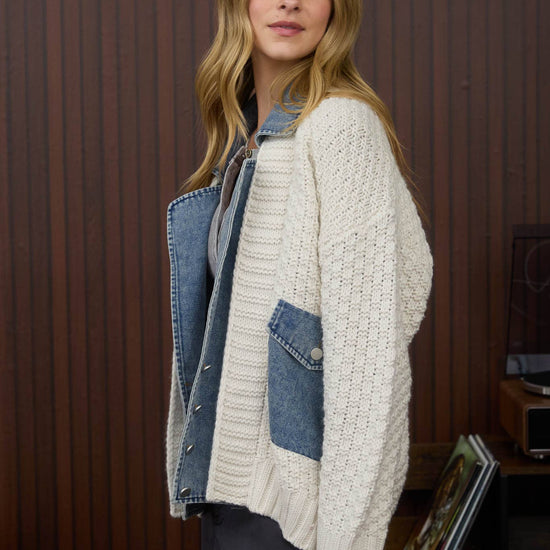 MIXED MEDIA CABLE KNIT DENIM TRIM JACKET