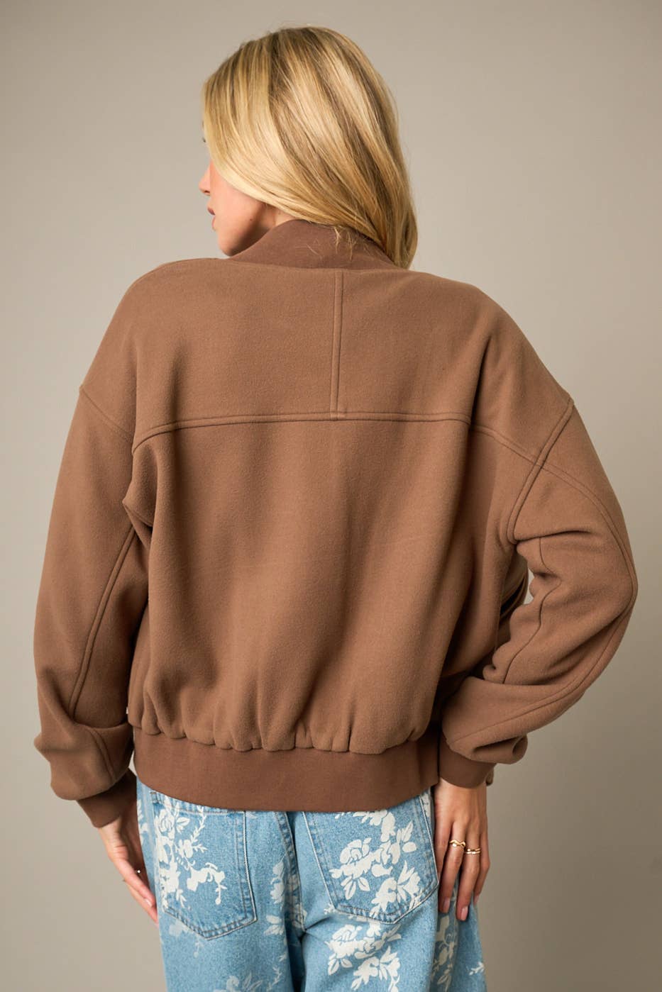 - SOFT SCUBA FABRIC - RIBBED DETAIL ON COLLAR, HEM, CUFF - SNAP BUTTON CLOSURE FRONT - LONG SLEEVE - POCKETS - RELAXED FIT - BOMBER JACKET MODEL IS 5'8" AND WEARING SIZE SMALL # FALL, WINTER, BOMBER JACKET, UTILITY, LONG SLEEVES, CASUAL, COZY, BUTTONS, BUTTONED JACKET, OUTERWEAR
