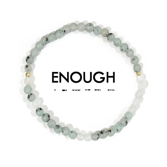 JUST AS YOU ARE. NOTHING MORE, NOTHING LESS. THIS MORSE CODE BRACELET SPELLS OUT ENOUGH IN THE BEAD PATTERN REMINDING YOU, AS YOU WEAR IT TO REMEMBER THAT EACH DAY YOU ARE ENOUGH, JUST AS YOU ARE. WEAR ALONE OR STACK WITH ANOTHER MEANINGFUL WORD! YOUR PURCHASE HELPS TO PROVIDE ECONOMIC EMPOWERMENT FOR WOMEN WHO ARE SURVIVORS OF HUMAN TRAFFICKING AND EXPLOITATION. EACH PIECE IS HANDCRAFTED BY THE WOMAN IT HELPS TO EMPLOY. THROUGH WEARING ETHIC GOODS, YOU BECOME A MEANINGFUL PART OF HER STORY, AND GIVE FREEDOM TO WOMEN AROUND THE WORLD. DETAILS * LENGTH - 6.75" | STRETCHES TO 7.5" * HANDMADE WITH LOVE IN THAILAND * MADE WITH SEMI-PRECIOUS STONES, HEMATITE, GLASS BEADS, AND ELASTIC.
