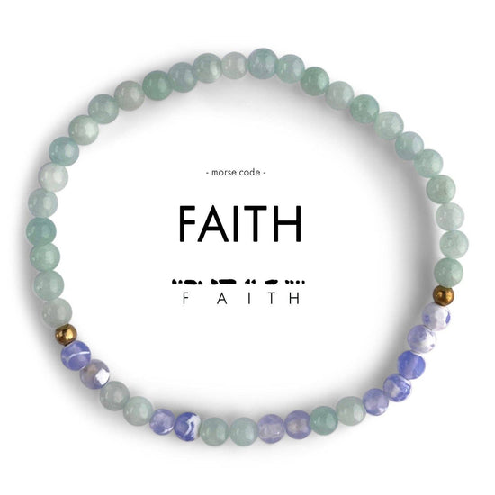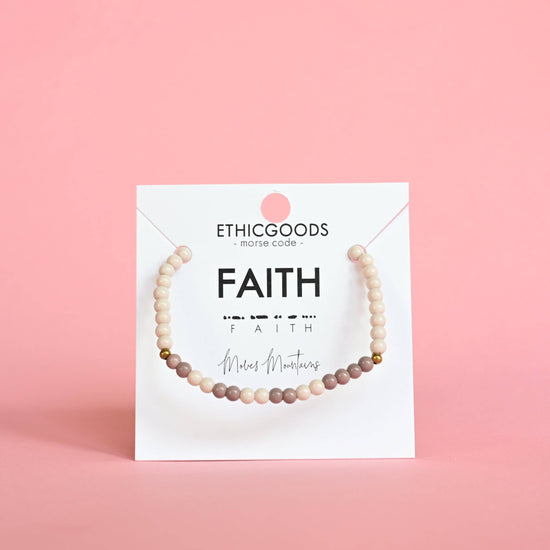 FAITH MOVES MOUNTAINS. FAITH GETS US THROUGH WHEN THINGS SEEM IMPOSSIBLE! WHAT ARE YOU BELIEVING FOR? THIS BRACELET LOOKS GREAT ALONE OR STACKED WITH YOUR OTHER FAVORITE MORSE CODE OR STONE STACKING BRACELETS! HOW TO READ YOUR JEWELRY: A MORSE CODE DOT IS ONE BEAD AND A DASH IS TWO BEADS IN THE ALTERNATING COLOR. START AT THE SMALL GOLD SPACER BEAD AND FOLLOW THE MORSE CODE SPELLING AROUND THE BRACELET! YOUR PURCHASE HELPS TO PROVIDE ECONOMIC EMPOWERMENT FOR WOMEN WHO ARE SURVIVORS OF HUMAN TRAFFICKING AND EXPLOITATION. EACH PIECE IS HANDCRAFTED BY THE WOMAN IT HELPS TO EMPLOY. THROUGH WEARING ETHIC GOODS, YOU BECOME A MEANINGFUL PART OF HER STORY, AND GIVE FREEDOM TO WOMEN AROUND THE WORLD. DETAILS * LENGTH - 6.75" | STRETCHES TO 7.5" * HANDMADE WITH LOVE IN THAILAND * MADE WITH SEMI-PRECIOUS STONES, HEMATITE, GLASS BEADS, AND ELASTIC