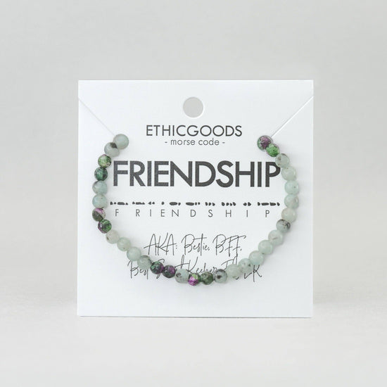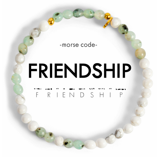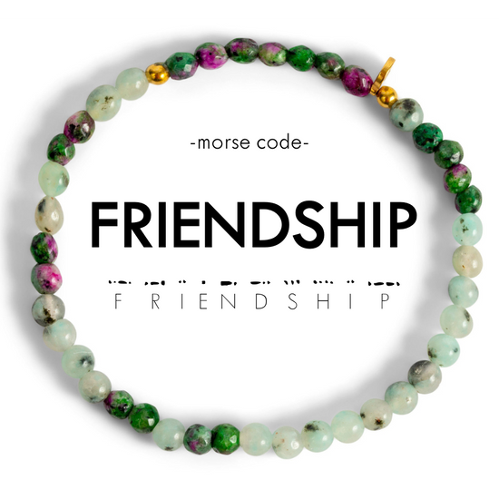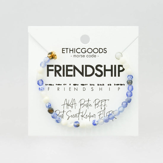 FRIENDSHIP AKA: BESTIE, BFF, BEST SECRET KEEPER EVER. THIS BRACELET LOOKS GREAT ALONE OR STACKED WITH YOUR OTHER FAVORITE MORSE CODE OR STONE STACKING BRACELETS! HOW TO READ YOUR JEWELRY: A MORSE CODE DOT IS ONE BEAD AND A DASH IS TWO BEADS IN THE ALTERNATING COLOR. START AT THE SMALL GOLD SPACER BEAD AND FOLLOW THE MORSE CODE SPELLING AROUND THE BRACELET! YOUR PURCHASE HELPS TO PROVIDE ECONOMIC EMPOWERMENT FOR WOMEN WHO ARE SURVIVORS OF HUMAN TRAFFICKING AND EXPLOITATION. EACH PIECE IS HANDCRAFTED BY THE WOMAN IT HELPS TO EMPLOY. THROUGH WEARING ETHIC GOODS, YOU BECOME A MEANINGFUL PART OF HER STORY, AND GIVE FREEDOM TO WOMEN AROUND THE WORLD. DETAILS * LENGTH - 6.75" | STRETCHES TO 7.5 * HANDMADE WITH LOVE IN THAILAND * MADE WITH SEMI-PRECIOUS STONES, HEMATITE, GLASS BEADS, AND ELASTIC.