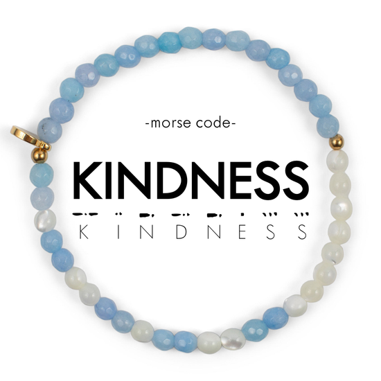 KINDNESS BE FEARLESSLY KIND. THIS BRACELET LOOKS GREAT ALONE OR STACKED WITH YOUR OTHER FAVORITE MORSE CODE OR STONE STACKING BRACELETS! HOW TO READ YOUR JEWELRY: A MORSE CODE DOT IS ONE BEAD AND A DASH IS TWO BEADS IN THE ALTERNATING COLOR. START AT THE SMALL GOLD SPACER BEAD AND FOLLOW THE MORSE CODE SPELLING AROUND THE BRACELET! YOUR PURCHASE HELPS TO PROVIDE ECONOMIC EMPOWERMENT FOR WOMEN WHO ARE SURVIVORS OF HUMAN TRAFFICKING AND EXPLOITATION. EACH PIECE IS HANDCRAFTED BY THE WOMAN IT HELPS TO EMPLOY. THROUGH WEARING ETHIC GOODS, YOU BECOME A MEANINGFUL PART OF HER STORY, AND GIVE FREEDOM TO WOMEN AROUND THE WORLD. DETAILS * LENGTH - 7.75" | STRETCHES TO 8.5" * HANDMADE WITH LOVE IN THAILAND * MADE WITH SEMI-PRECIOUS STONES, HEMATITE, GLASS BEADS, AND ELASTIC