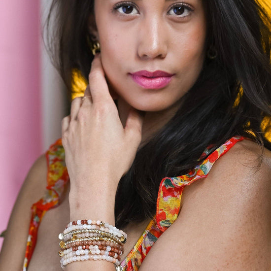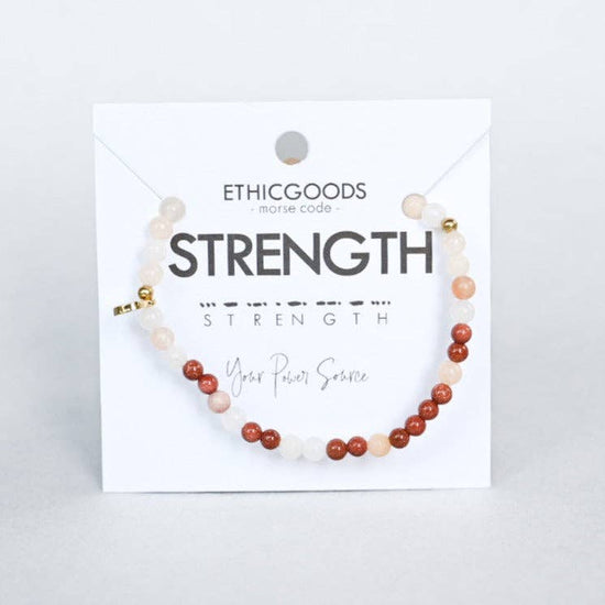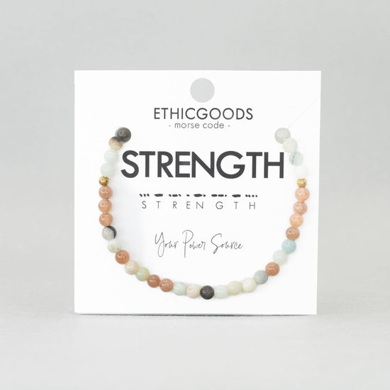 STRENGTH YOUR POWER SOURCE. A REMINDER OF THE STRENGTH WITHIN AND THAT NO MATTER HOW MANY TIMES YOU GET KNOCKED DOWN, YOU HAVE THE STRENGTH TO GET BACK UP. THIS BRACELET LOOKS GREAT ALONE OR STACKED WITH YOUR OTHER FAVORITE MORSE CODE OR STONE STACKING BRACELETS! HOW TO READ YOUR JEWELRY: A MORSE CODE DOT IS ONE BEAD AND A DASH IS TWO BEADS IN THE ALTERNATING COLORS. START AT THE SMALL GOLD SPACER BEAD AND FOLLOW THE MORSE CODE SPELLING AROUND THE BRACELET! YOUR PURCHASE HELPS TO PROVIDE ECONOMIC EMPOWERMENT FOR WOMEN WHO ARE SURVIVORS OF HUMAN TRAFFICKING AND EXPLOITATION. EACH PIECE IS HANDCRAFTED BY THE WOMAN