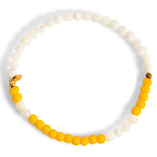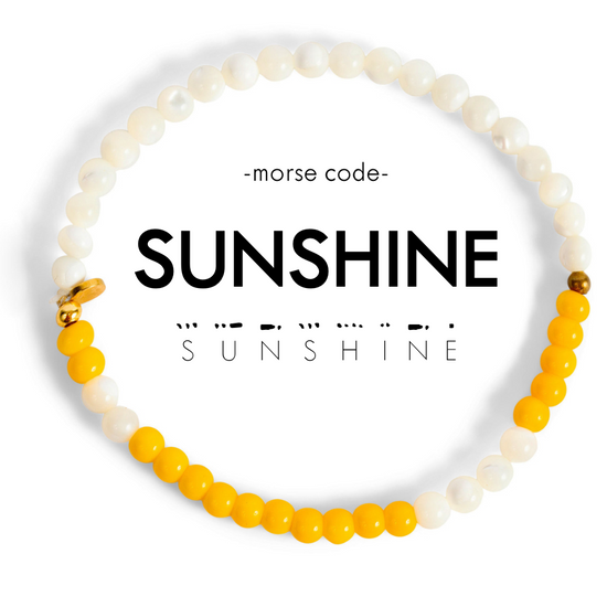 "...WHEN SKIES ARE GREY" BID GOODBYE TO GRAY SKIES, 'CAUSE THIS BRIGHT YELLOW MORSE CODE BRACELET IS HERE TO STAY! EVERYONE CAN USE A LITTLE MORE SUNSHINE- SO MAKE SURE TO STYLE YOUR WRIST WITH THIS NEW WORD TODAY! HOW TO READ YOUR JEWELRY: A MORSE CODE DOT IS ONE BEAD AND A DASH IS TWO BEADS IN THE ALTERNATING COLORS. START AT THE SMALL GOLD SPACER BEAD AND FOLLOW THE MORSE CODE SPELLING AROUND THE BRACELET! YOUR PURCHASE HELPS TO PROVIDE ECONOMIC EMPOWERMENT FOR WOMEN WHO ARE SURVIVORS OF HUMAN TRAFFICKING AND EXPLOITATION. EACH PIECE IS HANDCRAFTED BY THE WOMAN IT HELPS TO EMPLOY. THROUGH WEARING ETHIC GOODS, YOU BECO