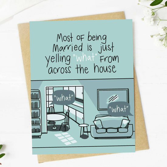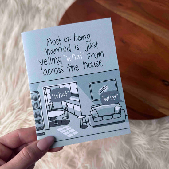 "MOST OF BEING MARRIED IS JUST YELLING 'WHAT' FROM ACROSS THE HOUSE" FUNNY GREETING CARD. HAND ILLUSTRATED CARD WITH FUNNY COMIC AND RELATABLE MARRIAGE ADVICE. THIS MAKES THE PERFECT WEDDING CARD OR CAN BE USED FOR ANNIVERSARIES. -A2 SIZE (4.25 X 5.5 INCHES FOLDED).