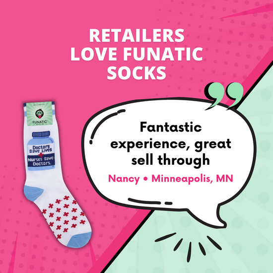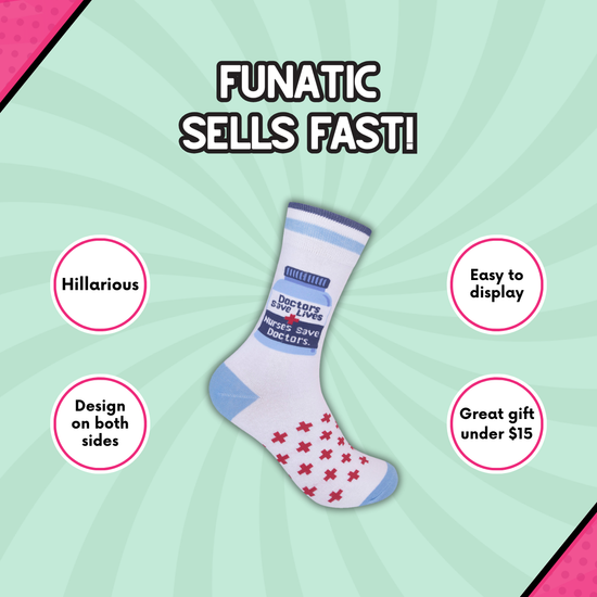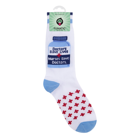 PAGING ALL MEDICAL PROS WITH A SENSE OF HUMOR!. YOUR NEW FAVORITE SOCKS HAVE ARRIVED. THESE DOCTORS SAVE LIVES, NURSES SAVE DOCTORS SOCKS DELIVER A HEALTHY DOSE OF TRUTH, STRAIGHT FROM THE BREAK ROOM. DESIGNED FOR THE HARDWORKING HEROES OF HOSPITALS, CLINICS, AND ANYWHERE A BLOOD PRESSURE CUFF MIGHT BE INVOLVED, THEY’RE A CHEEKY NOD TO THE BEHIND-THE-SCENES TEAMWORK THAT KEEPS PATIENTS (AND DOCTORS) ALIVE. THE DESIGN FEATURES A CRISP WHITE BACKGROUND WITH A LIGHT BLUE TOE, HEEL, AND CUFF STRIPES, PLUS A RED CROSS PATTERN MARCHING ACROSS THE FOOT LIKE IT’S GOT ROUNDS TO MAKE. FRONT AND CENTER IS A CLASSIC MEDICINE BOTTLE GRAPHIC WITH THE REAL PRESCRIPTION FOR SUCCESS: “DOCTORS SAVE LIVES, NURSES SAVE DOCTORS.” MADE FROM A COMFY, BREATHABLE BLEND OF 70% COTTON, 28% POLYESTER, AND 2% ELASTIC, THESE MID-CALF CREW SOCKS FIT MOST FEET (MEN’S 6–11, WOMEN’S 7.5–12). PERFECT FOR LONG SHIFTS, POST-SHIFT NAPS, OR JUST REMINDING EVERYONE WHO ACTUALLY KEEPS THINGS RUNNING.