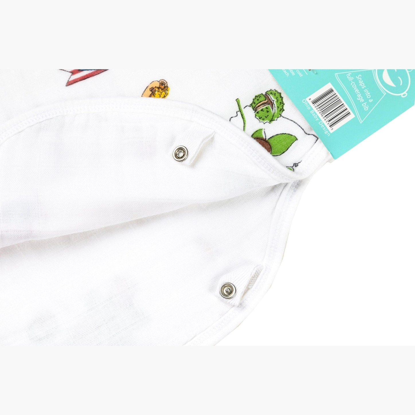 * MACHINE WASHABLE * SIZE: 10" X 24" * MATERIAL: BAMBOO RAYON, COTTON MUSLIN * USES: BURP COTH, SNAPPING WRAP AROUND BIB * 5 LAYERS OF THICKNESS * INCLUDES SNAP