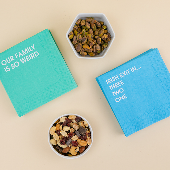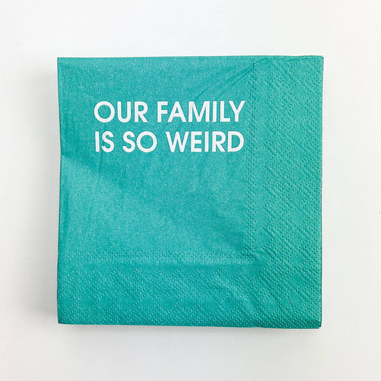 CELEBRATE YOUR PECULIAR GENE POOL WITH "OUR FAMILY IS SO WEIRD" NAPKINS, BECAUSE EVERY GATHERING IS A CHANCE TO SAY: "YEP, WE'RE RELATED AND YES, WE'RE THIS FUCKING WEIRD." ENJOY. SEALED CELLO OF 20 3-PLY NAPKINS SIZE: 5 X 5 IN, 10 X 10 IN WHEN UNFOLDED PRINTING: WHITE INK NAPKIN COLOR: GREEN ENVIRONMENTALLY FRIENDLY, WATER-BASED COLORS, BLEACHED WITHOUT CHLORINE. BIODEGRADABLE. WARNING: COLORS MAY TRANSFER WHEN WET.