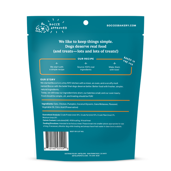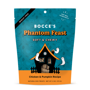 TREAT YOUR PUP WITH FALL OR SPOOKY SNACKS THAT'LL MAKE EVERY MOMENT A HOWLING GOOD TIME! 6OZ FLAVOR: CHICKEN & PUMPKIN RECIPE ALL NATURAL INGREDIENTS WHEAT-FREE BAKED IN THE USA INGREDIENTS: OATS, CHICKEN, PUMPKIN, COCONUT GLYCERIN, CANE MOLASSES, FLAXSEED, VEGETABLE OIL, CITRIC ACID (PRESERVATIVE) GUARANTEED ANALYSIS: CRUDE PROTEIN (MIN) 10%, CRUDE FAT (MIN) 10%, CRUDE FIBER (MAX) 3%, MOISTURE (MAX) 8% CALORIE CONTENT: (CALCULATED) ME: 4108 KCAL/KG, 14 KCAL/TREAT