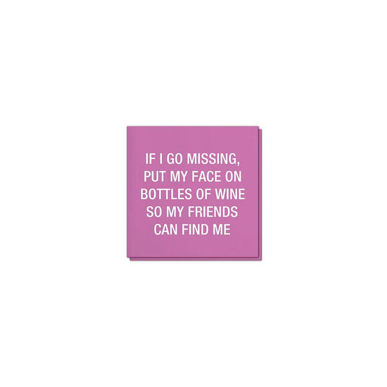 IF I GO MISSING, PUT MY FACE ON BOTTLES OF WINE SO MY FRIENDS CAN FIND ME. 5" X 5" FOLDED 3-PLY COCKTAIL NAPKINS