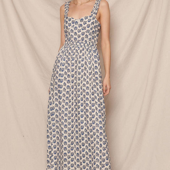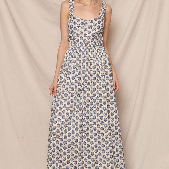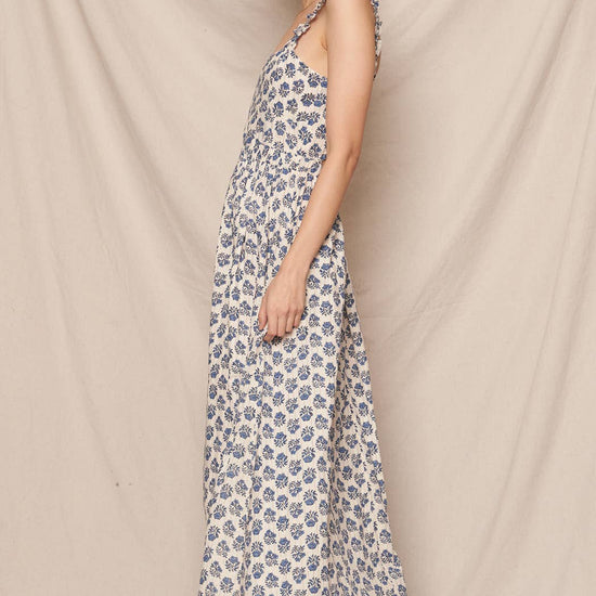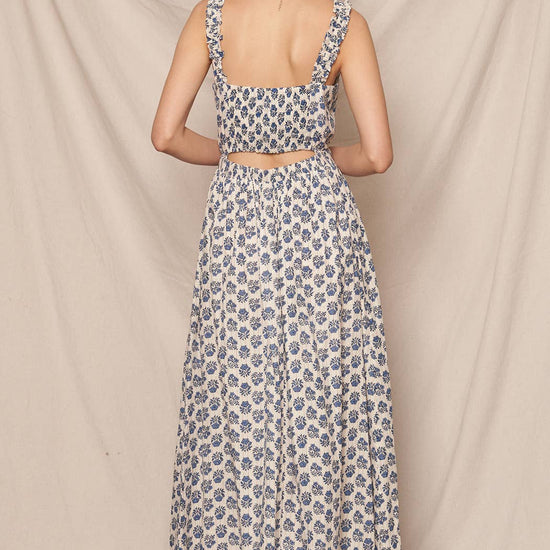 SLEEVELESS PRINTED MAXI DRESS WITH OPEN BACK DETAIL SELF: 98% COTTON 2% LUREX LINING: 100% COTTON SIZE S(2) - M(2) - L(2) MADE IN INDIA * MODEL IS 5'8" AND IS WEARING A SMALL.