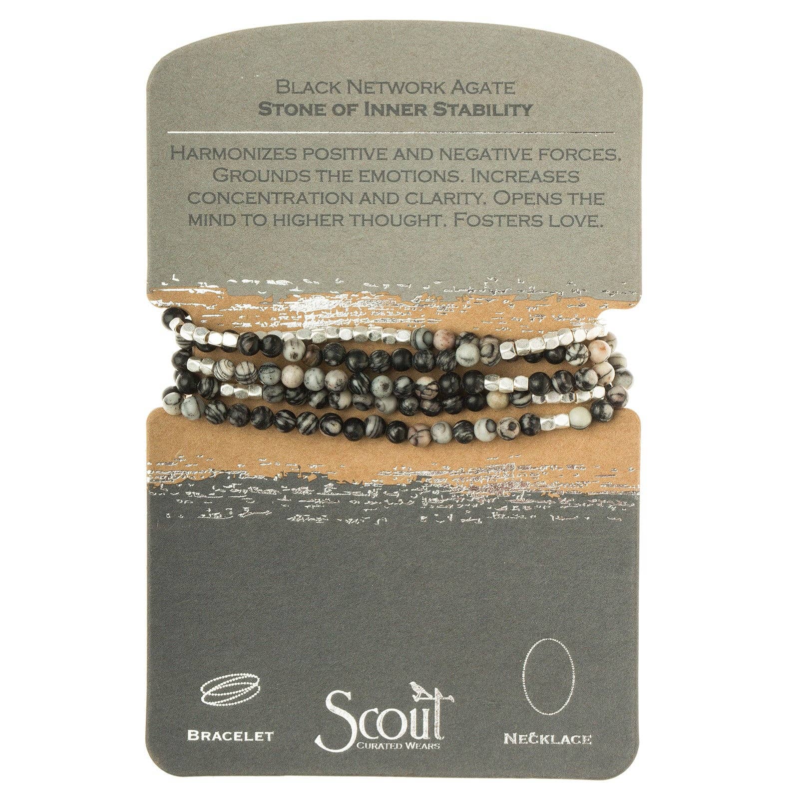 BRACELET BECOMES A NECKLACE & TA-DA! TAP INTO THE ENERGIES OF THE EARTH. SEMI PRECIOUS GEMSTONES ADORN WRIST & NECKLINE. EFFORTLESSLY CONVERTS FROM BRACELET TO NECKLACE. CAN BE WRAPPED 4-5 TIMES AS A BRACELET AND 1-2 TIMES AS A NECKLACE. • 34" LENGTH • MATERIALS: 4.5MM SEMI PRECIOUS STONE BEADS, PLATED BRASS, STRETCH CORD • PRESENTED ON CARDS THAT TELL THE MEANING OF EACH STONE BLACK NETWORK AGATE | STONE OF INNER STABILITY. HARMONIZES POSITIVE AND NEGATIVE FORCES. GROUNDS THE EMOTIONS. INCREASES CONCENTRATION AND CLARITY. OPENS THE MIND TO HIGHER THOUGHT. FOSTERS LOVE. DISCOVER THE PERFECT JEWELRY PIECES TO COMPLEMENT YOUR STYLE THIS SPRING AND SUMMER. MAKES FOR A WONDERFUL BIRTHDAY, GRADUATION, OR MOTHER'S DAY GIFT.