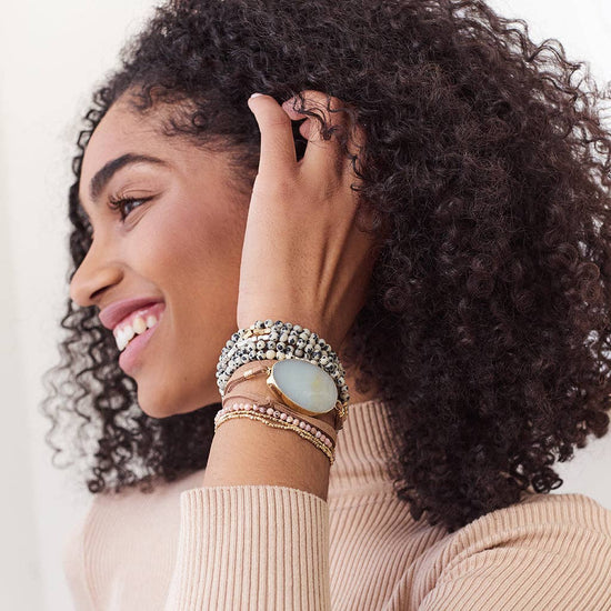BRACELET BECOMES A NECKLACE & TA-DA! TAP INTO THE ENERGIES OF THE EARTH. SEMI PRECIOUS GEMSTONES ADORN WRIST & NECKLINE. EFFORTLESSLY CONVERTS FROM BRACELET TO NECKLACE. CAN BE WRAPPED 4-5 TIMES AS A BRACELET AND 1-2 TIMES AS A NECKLACE. • 34" LENGTH • MATERIALS: 4.5MM SEMI PRECIOUS STONE BEADS, PLATED BRASS, STRETCH CORD • PRESENTED ON CARDS THAT TELL THE MEANING OF EACH STONE DALMATIAN JASPER | STONE OF JOY DISCOVER THE PERFECT JEWELRY PIECES TO COMPLEMENT YOUR STYLE THIS SPRING AND SUMMER. MAKES FOR A WONDERFUL BIRTHDAY, GRADUATION, OR MOTHER'S DAY GIFT.