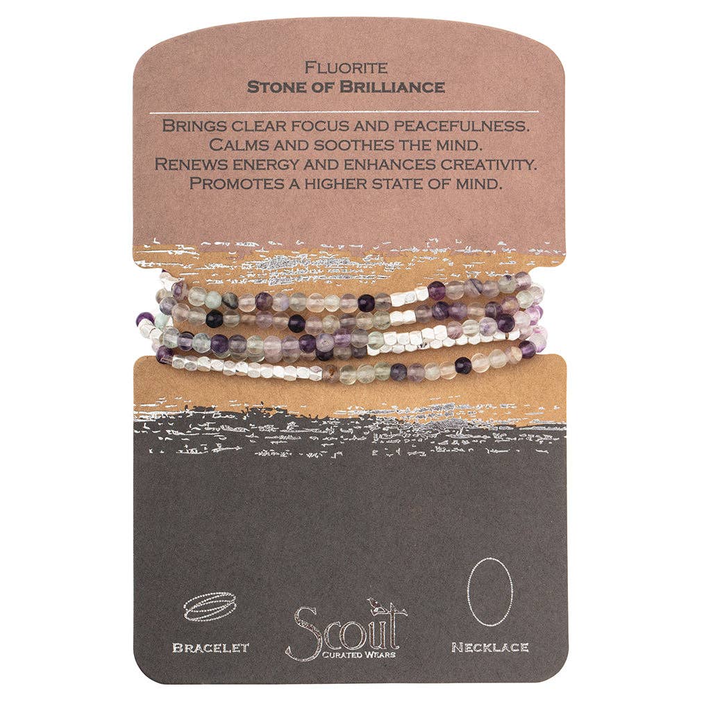 BRACELET BECOMES A NECKLACE & TA-DA! TAP INTO THE ENERGIES OF THE EARTH. SEMI PRECIOUS GEMSTONES ADORN WRIST & NECKLINE. EFFORTLESSLY CONVERTS FROM BRACELET TO NECKLACE. CAN BE WRAPPED 4-5 TIMES AS A BRACELET AND 1-2 TIMES AS A NECKLACE. • 34" LENGTH • MATERIALS: 4.5MM SEMI PRECIOUS STONE BEADS, PLATED BRASS, STRETCH CORD • PRESENTED ON CARDS THAT TELL THE MEANING OF EACH STONE FLUORITE | STONE OF BRILLIANCE. BRINGS CLEAR FOCUS AND PEACEFULNESS. CALMS AND SOOTHES THE MIND. RENEWS ENERGY AND ENHANCES CREATIVITY. PROMOTES A HIGHER STATE OF MIND. DISCOVER THE PERFECT JEWELRY PIECES TO COMPLEMENT YOUR STYLE THIS SPRING AND SUMMER. MAKES FOR A WONDERFUL BIRTHDAY, GRADUATION, OR MOTHER'S DAY GIFT.