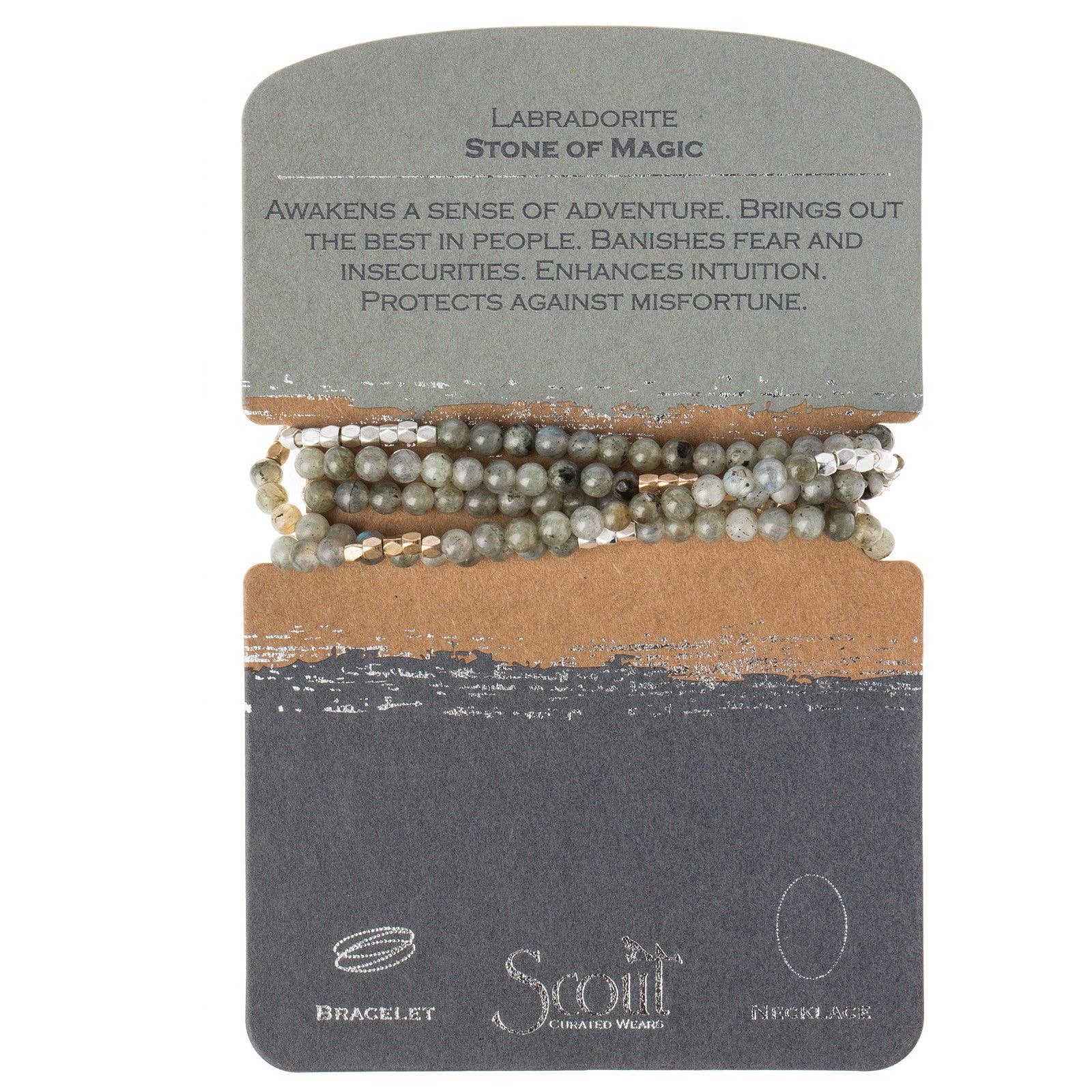 BRACELET BECOMES A NECKLACE & TA-DA! TAP INTO THE ENERGIES OF THE EARTH. SEMI PRECIOUS GEMSTONES ADORN WRIST & NECKLINE. EFFORTLESSLY CONVERTS FROM BRACELET TO NECKLACE. CAN BE WRAPPED 4-5 TIMES AS A BRACELET AND 1-2 TIMES AS A NECKLACE. • 34" LENGTH • MATERIALS: 4.5MM SEMI PRECIOUS STONE BEADS, PLATED BRASS, STRETCH CORD • PRESENTED ON CARDS THAT TELL THE MEANING OF EACH STONE LABRADORITE | STONE OF MAGIC. AWAKENS A SENSE OF ADVENTURE. BRINGS OUT THE BEST IN PEOPLE. BANISHES FEAR AND INSECURITIES. ENHANCES INTUITION. PROTECTS AGAINST MISFORTUNE. DISCOVER THE PERFECT JEWELRY PIECES TO COMPLEMENT YOUR STYLE THIS SPRING AND SUMMER. MAKES FOR A WONDERFUL BIRTHDAY, GRADUATION, OR MOTHER'S DAY GIFT.