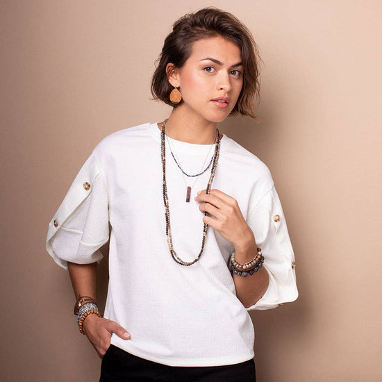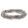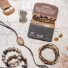 BRACELET BECOMES A NECKLACE & TA-DA! TAP INTO THE ENERGIES OF THE EARTH. SEMI PRECIOUS GEMSTONES ADORN WRIST & NECKLINE. EFFORTLESSLY CONVERTS FROM BRACELET TO NECKLACE. CAN BE WRAPPED 4-5 TIMES AS A BRACELET AND 1-2 TIMES AS A NECKLACE. • 34" LENGTH • MATERIALS: 4.5MM SEMI PRECIOUS STONE BEADS, PLATED BRASS, STRETCH CORD • PRESENTED ON CARDS THAT TELL THE MEANING OF EACH STONE: RIVER STONE | STONE OF BALANCE. GIVES THE WEARER ENERGY FROM WATERS AROUND THE WORLD. FACILITATES CHANGE AND ENCOURAGES BALANCE. GROUNDING AND HARMONIZING. ATTRACTS PROSPERITY AND GOOD LUCK. DISCOVER THE PERFECT JEWELRY PIECES TO COMPLEMENT YOUR STYLE THIS SPRING AND SUMMER. MAKES FOR A WONDERFUL BIRTHDAY, GRADUATION, OR MOTHER'S DAY GIFT.